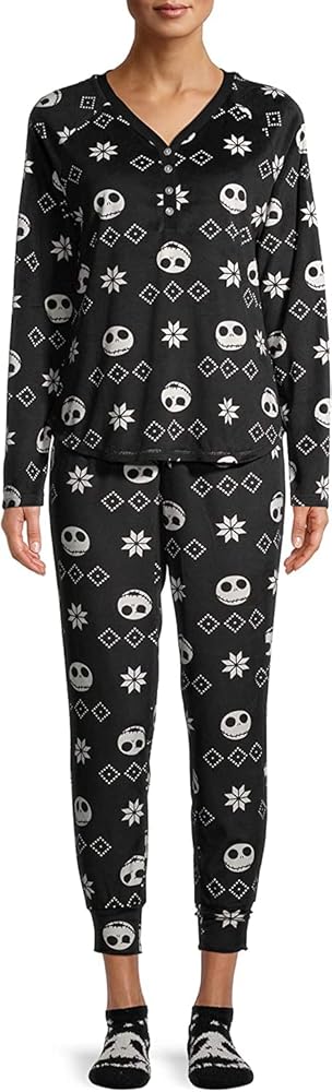 دلل نفسك، أو قم بإهداء محبي Nightmare Before Christmas في حياتك، مع طقم البيجامة المكون من ثلاث قطع والذي يتميز بشخصية مخيفة احتفالية للجميع - جاك سكيلينجتون! تتميز هذه المجموعة المريحة بجزء علوي مطبوع بالكامل بأكمام طويلة وبنطلون متناسق. لا تنس: حافظ على دفء قدميك مع الجوارب ذات الطابع الرقيق.