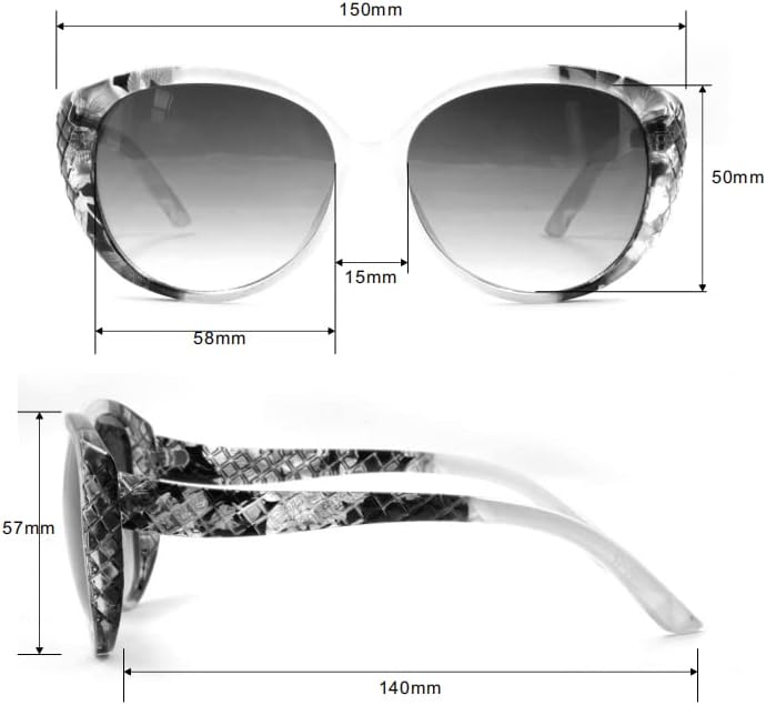 قياسات المنتج (بالملليمترات): عرض العدسة 58 مم، ارتفاع العدسة 50 مم، عرض الإطار 150 مم، ارتفاع الإطار 57 مم، طول الصدغ 140 مم، عرض الجسر 15 مم