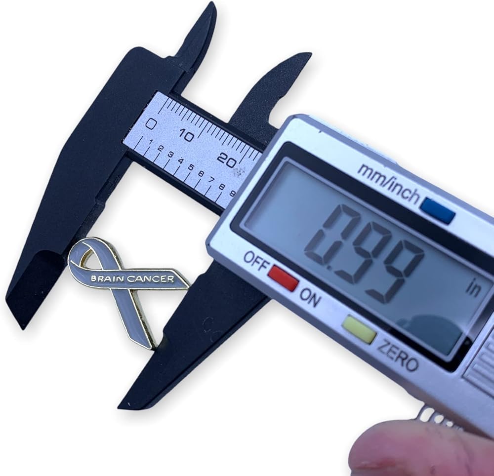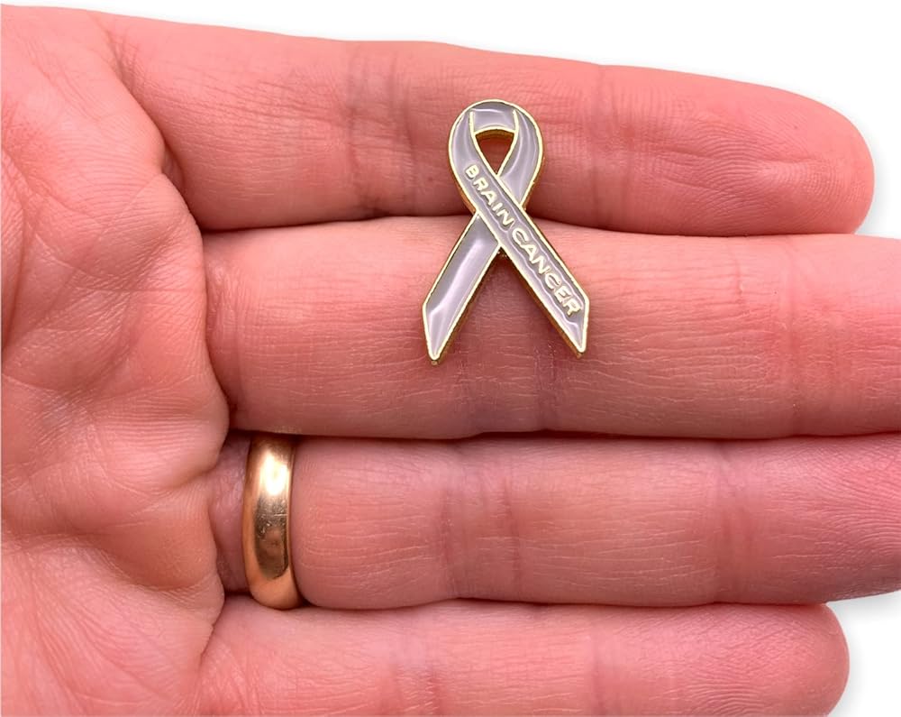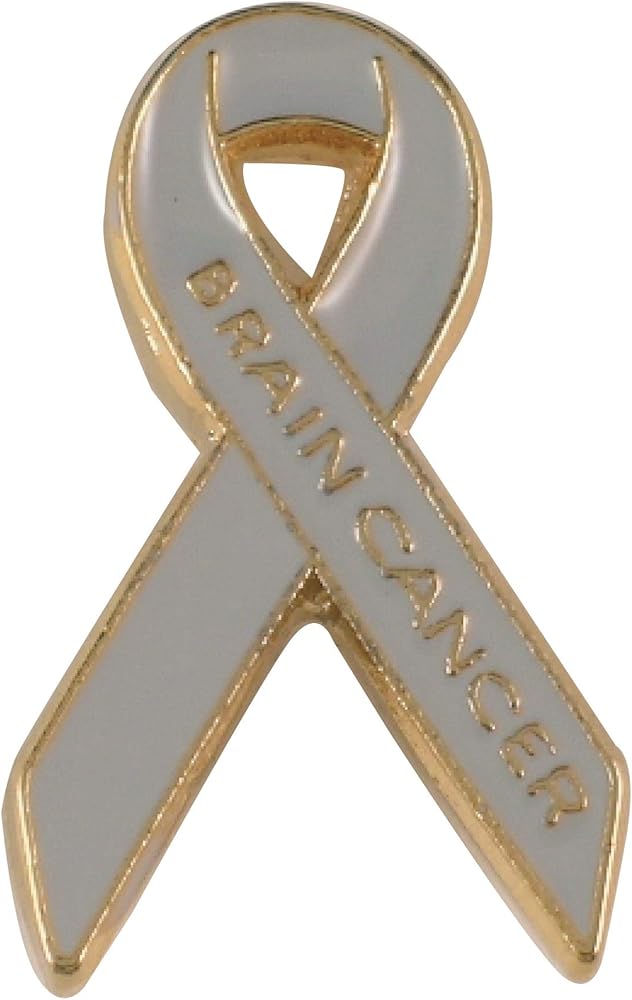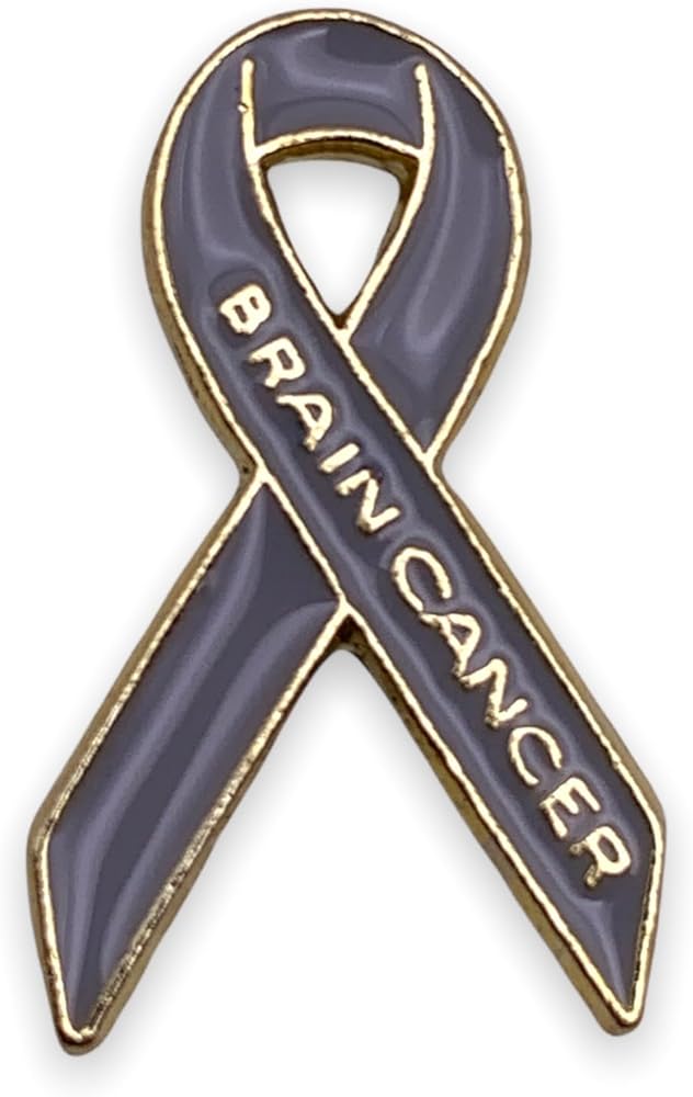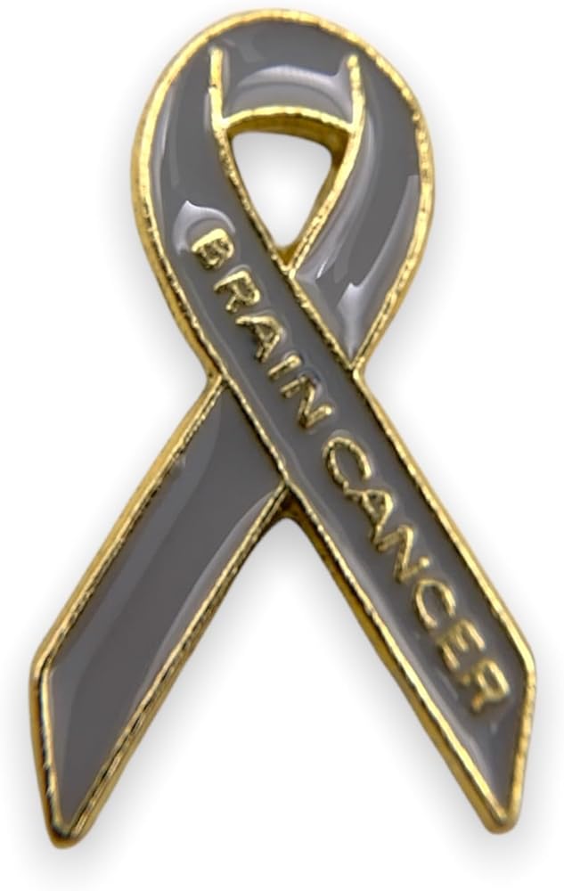 دبوس التوعية بسرطان الدماغ. هذا الدبوس هو شكل شريط التوعية الكلاسيكي باللون الذهبي مع عبارة "سرطان الدماغ" من المعدن الذهبي أسفل ساق الشريط. تحتوي الخلفية على لون المينا الرمادي الذي أصبح المعيار للتوعية بسرطان الدماغ. يبلغ مقاس كل دبوس شريطي لسرطان الدماغ 7/8 بوصة × 1/2 بوصة ويأتي في أكياس متعددة بشكل فردي مع ملحق قابض عسكري على الظهر. صُنع بفخر في الولايات المتحدة الأمريكية