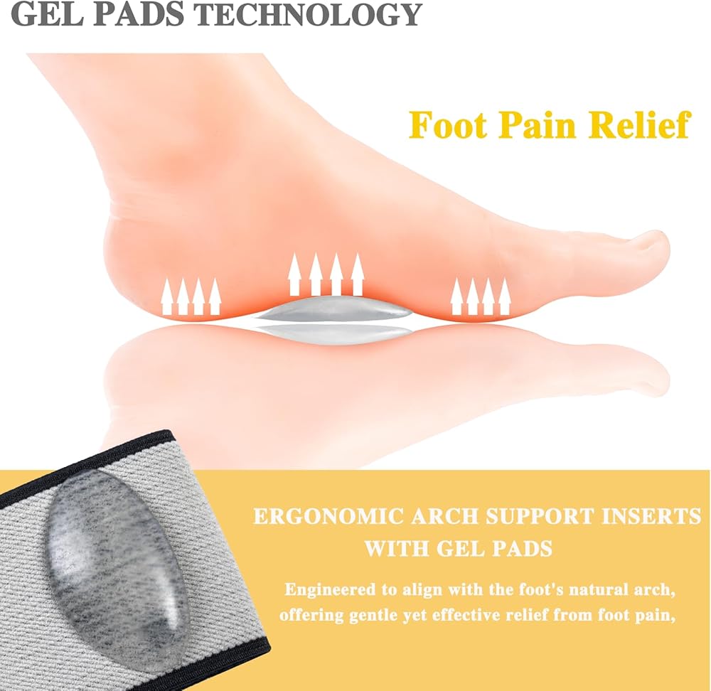 GEL PAD TECHNOLOGY: One of the standout features of compression arch support is its integrated gel pad technology. This gel pad offers exceptional cushioning and support to the arch of the foot,