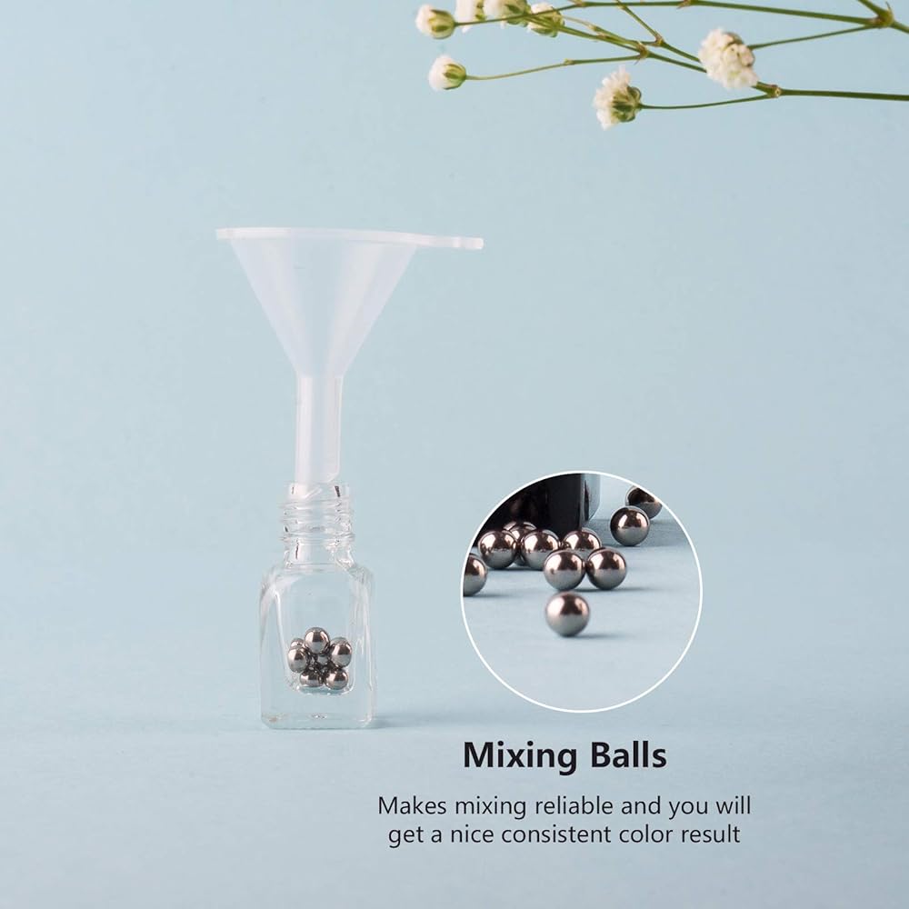 الأنابيب الشفافة تجعل من السهل رؤية الحجم المتبقي من مستحضرات التجميل؛ تحتوي كل زجاجة على كرة خلط لمنع الترسيب ويمكن أن تعمل بشكل رائع عند مزج الألوان الجديدة؛ يمكنك بسهولة نقل طلاء الأظافر أو أي سائل آخر إلى الزجاجة باستخدام الممرات.