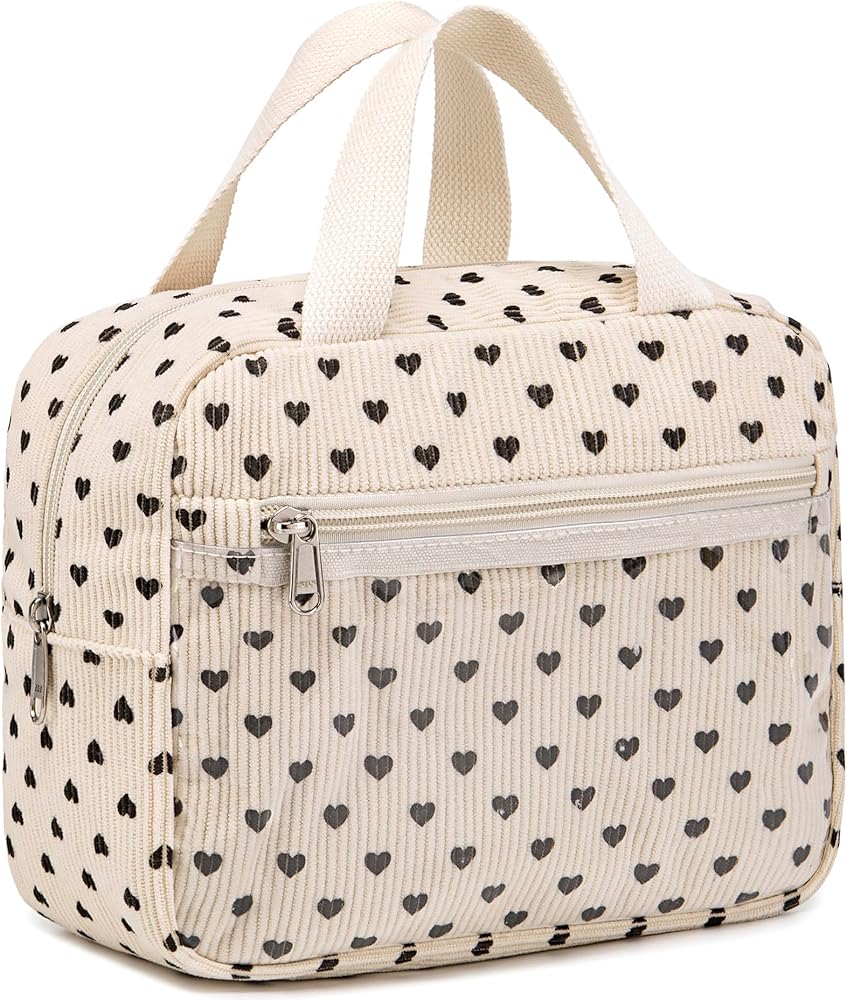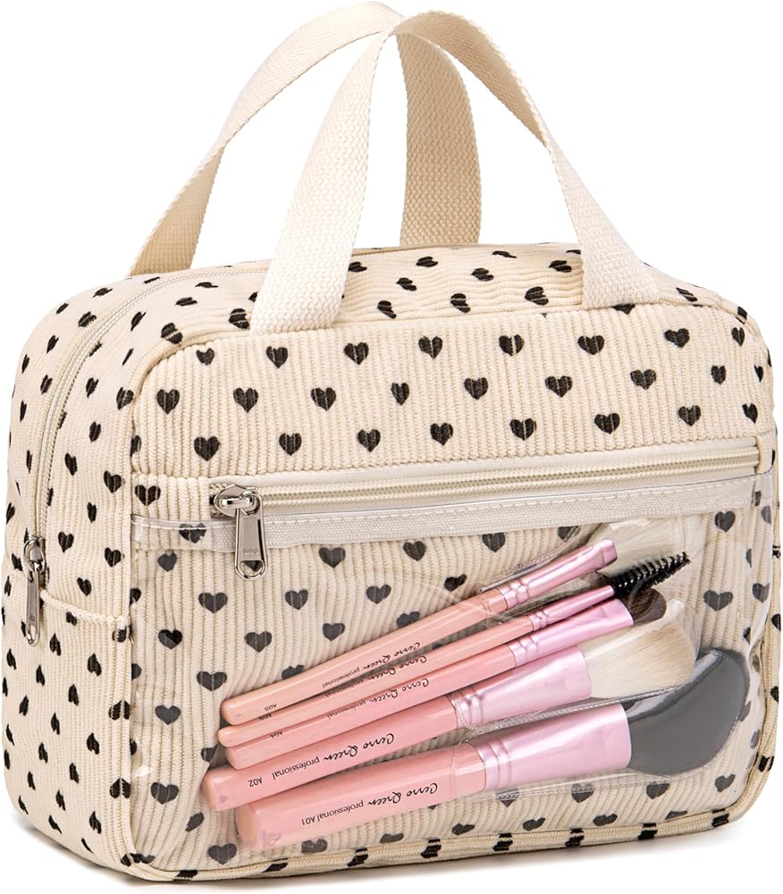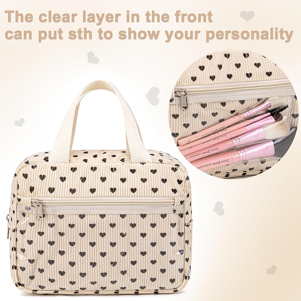 【مقاس حقيبة مكياج مضلعة】8.6 بوصة × 3.9 بوصة × 7.4 بوصة (الطول × العرض × الارتفاع). تناسب حقيبة المكياج هذه جميع مستحضرات التجميل والفرش. من السهل الإمساك بها والخروج منها. سروال قصير كريمي بقلب أسود لطيف وعصري.