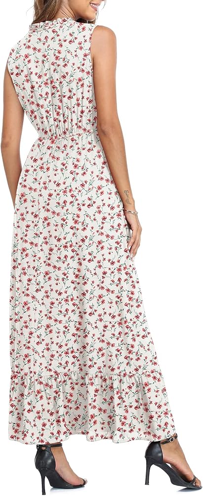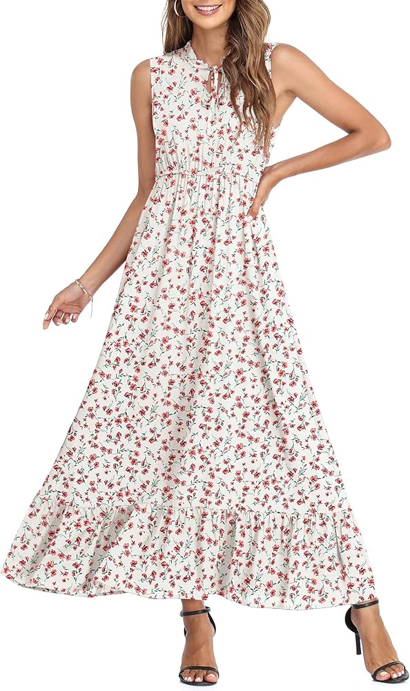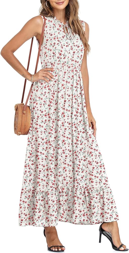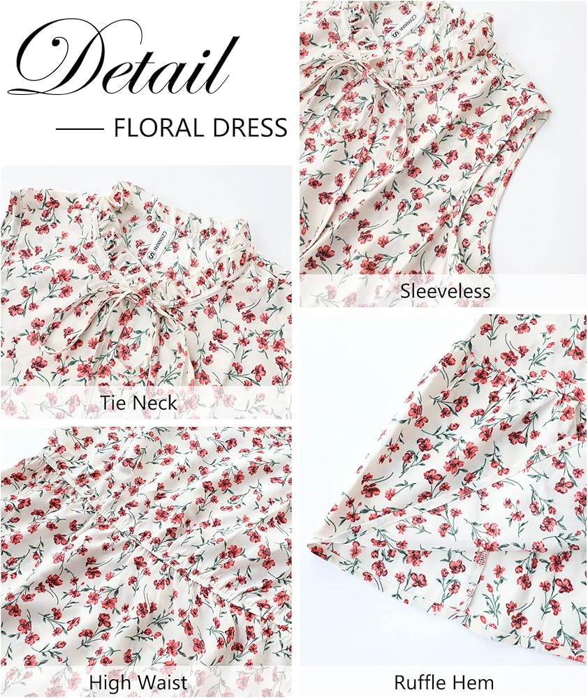 فستان CZYINXIAN نسائي صيفي بدون أكمام بربطة عنق عالي الخصر فستان بوهو غير رسمي مطبوع عليه زهور وحاشية مكشكشة فساتين طويلة للشاطئ