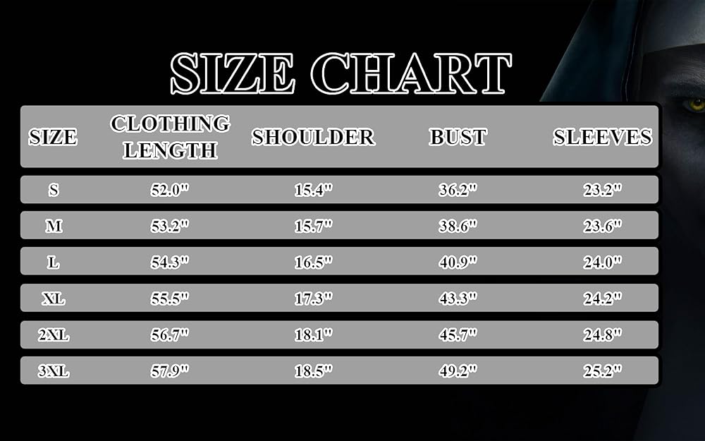 المقاس الدقيق: اختر المقاس المثالي من خلال الرجوع إلى جدول المقاسات الخاص بنا، مما يسمح لك بتجسيد مظهر الراهبة الأيقونية بأناقة وثقة.