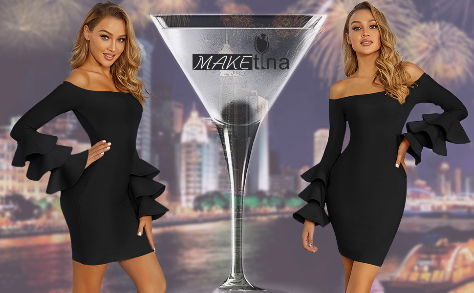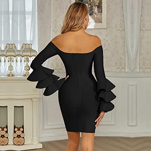فستان Maketina نسائي مثير بأشرطة مكشكشة وأكمام طويلة فساتين ضيقة متوسطة الطول للحفلات