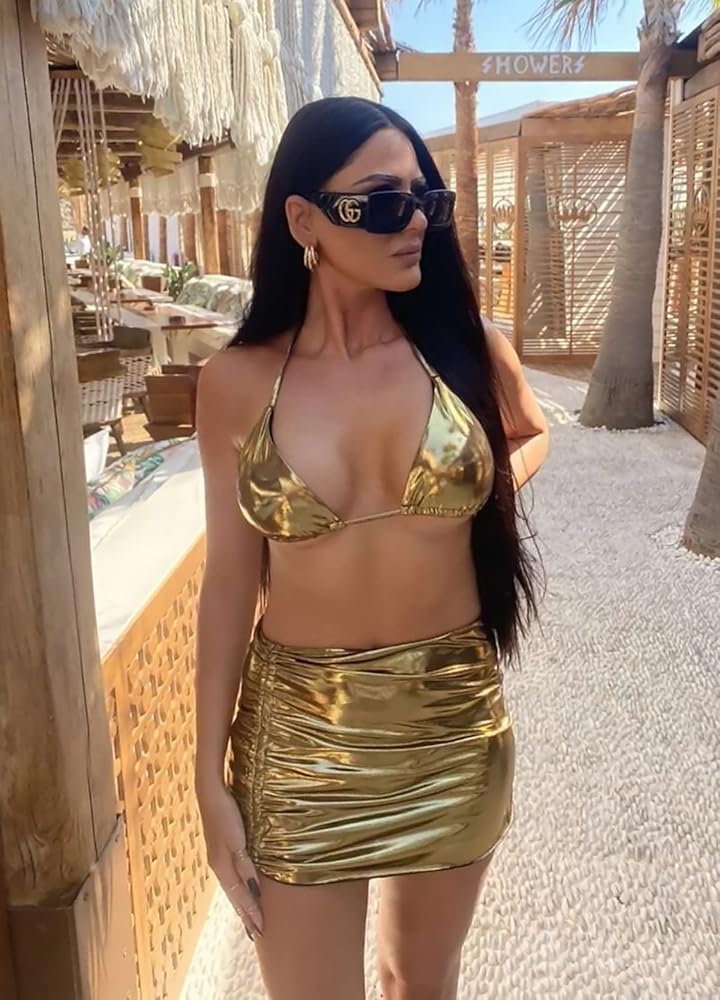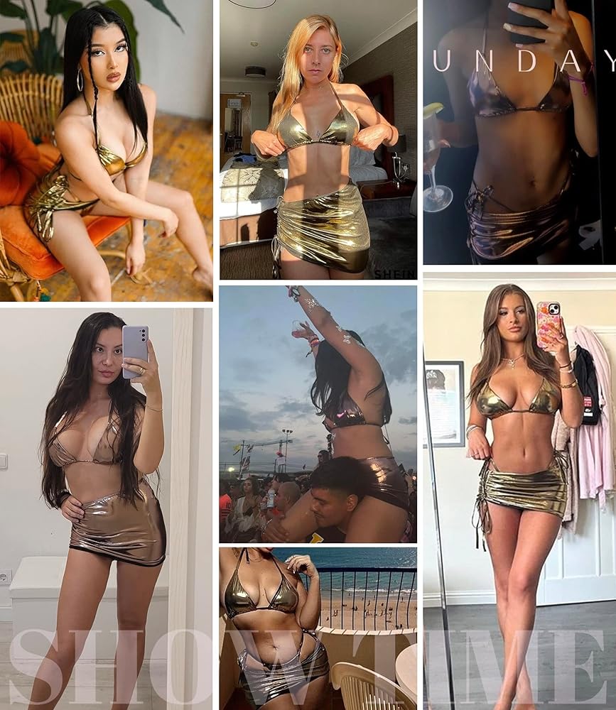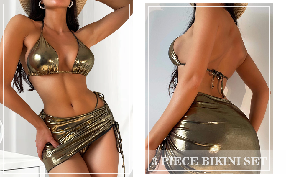 - الجزء العلوي: رباط خلفي، جزء علوي بيكيني لاسلكي، وسادة قابلة للإزالة؛ الجزء السفلي: جزء سفلي من بيكيني معدني ذو قصة عالية وتنورة شاطئ مكشكشة برباط