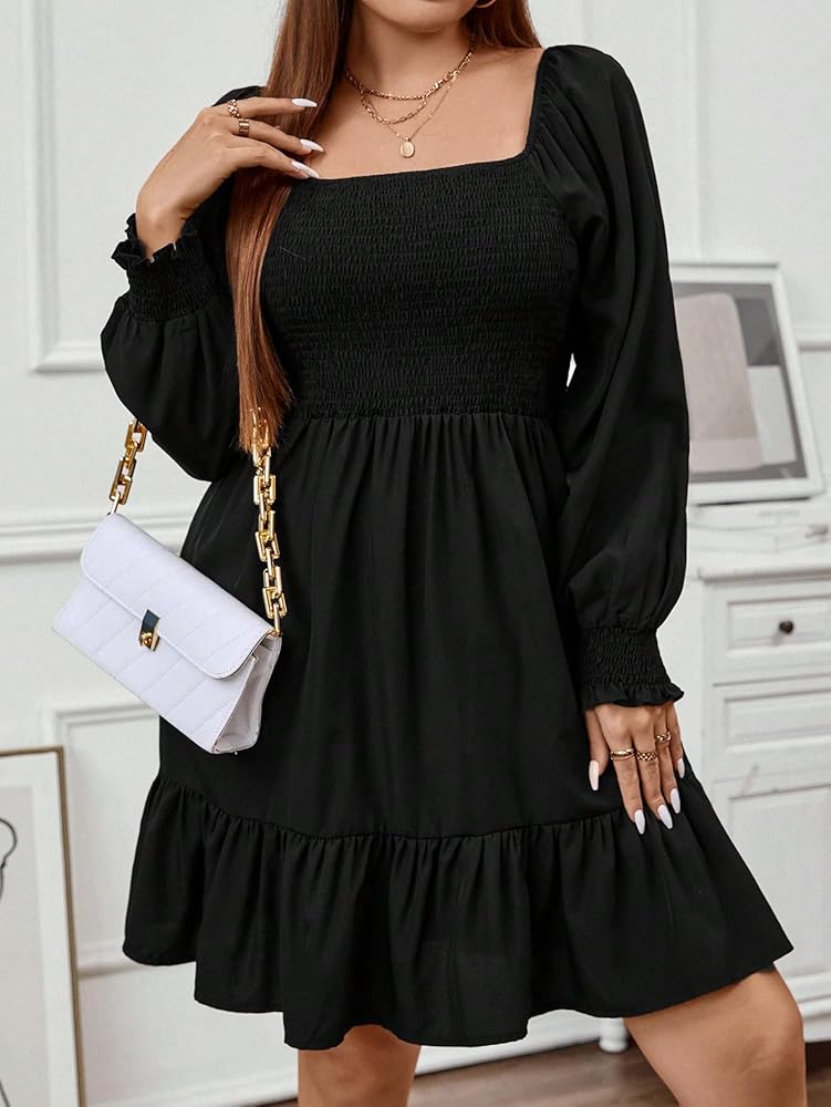 فستان WDIRARA نسائي مكشكش ومكشكش مقاس كبير ورقبة مربعة وأكمام منتفخة وحاشية واسعة كاجوال فضفاض
