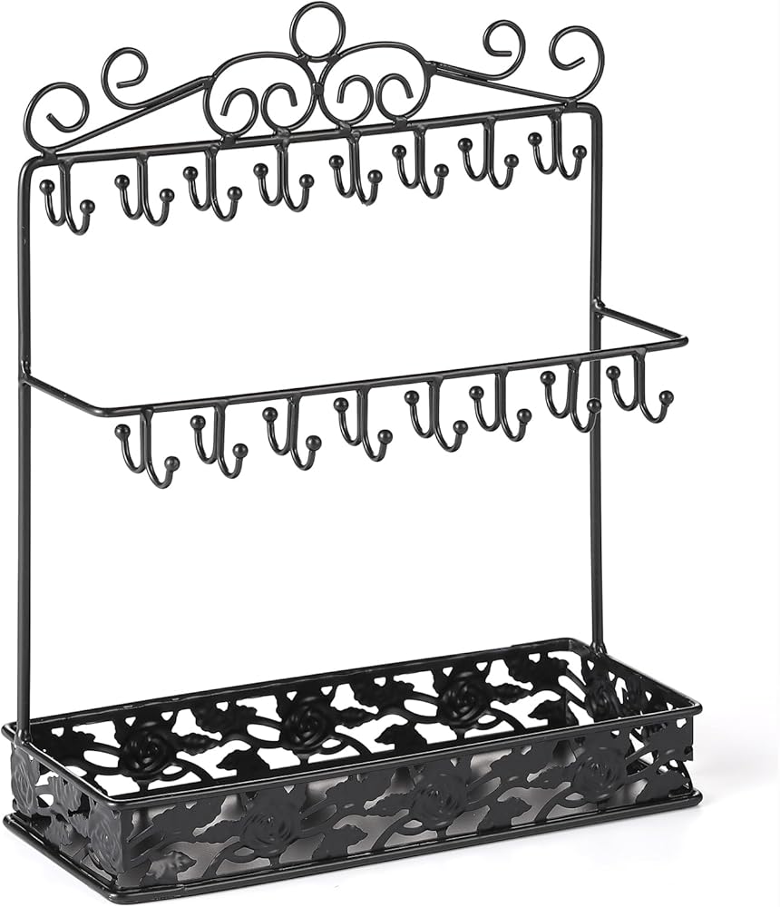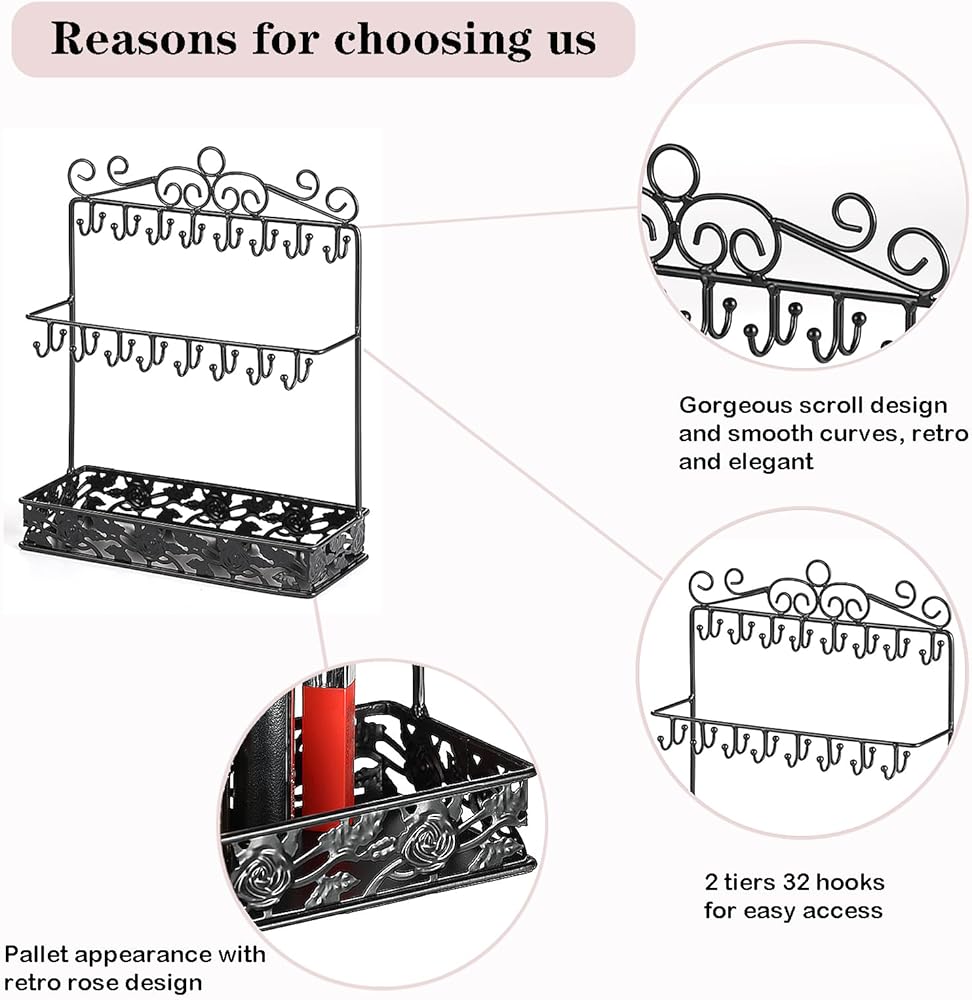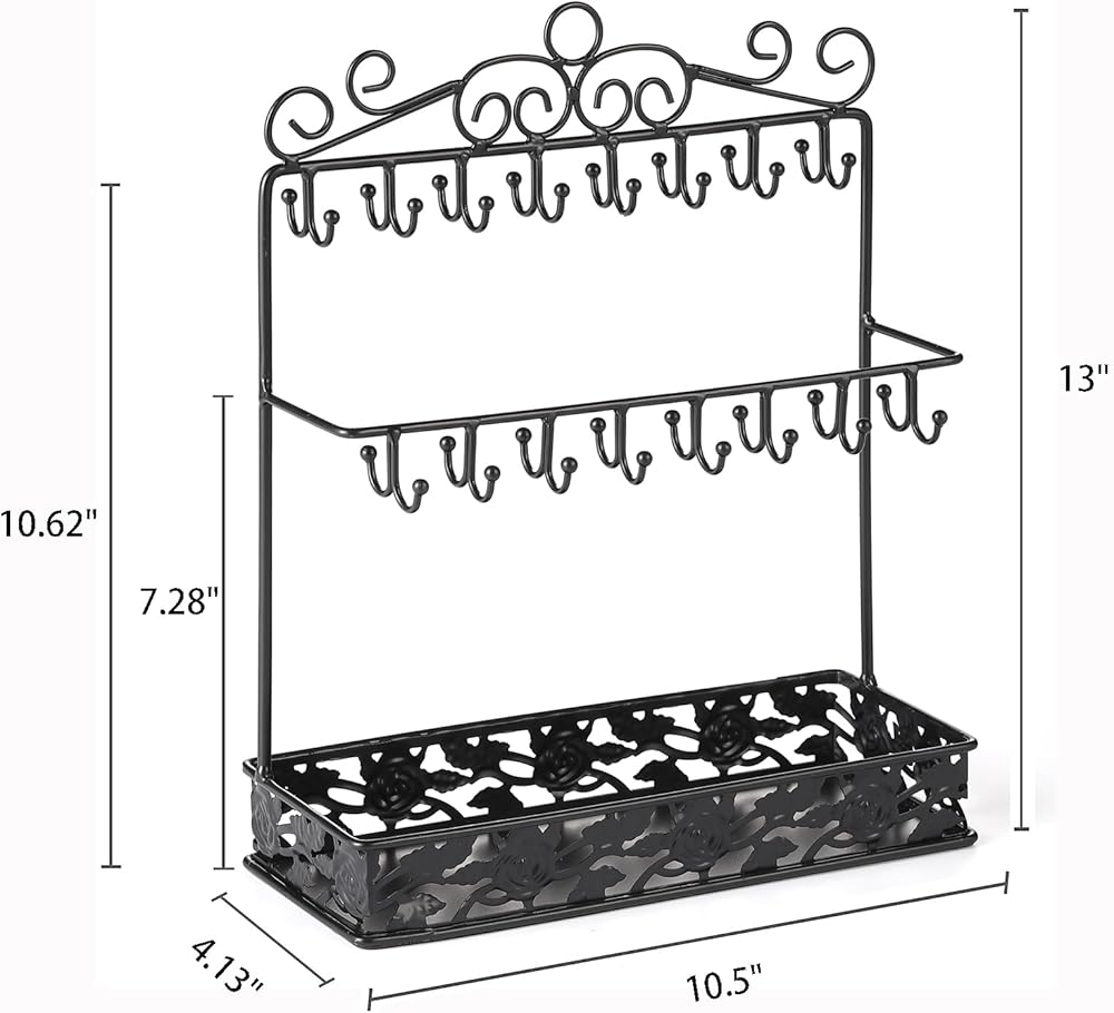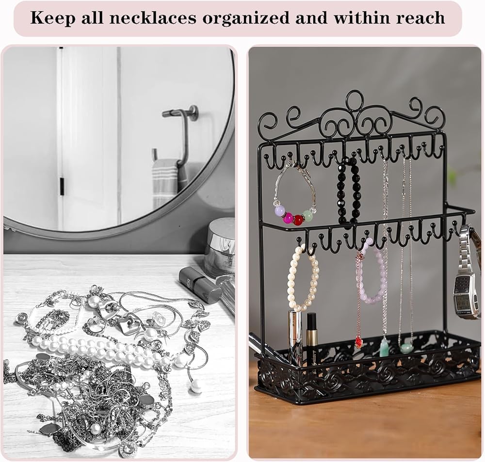 【تخزين واسع】حامل منظم القلادات بطول 13 سم مع طبقتين من 32 خطافًا وصينية كبيرة، هناك مساحة كبيرة لتعليق القلادة ووضع الأقراط أو الخواتم أو غيرها من المجوهرات.