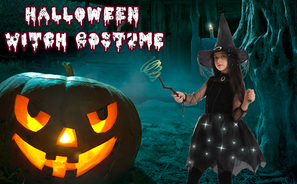 - مجموعة ساحرة كاملة: فستان الساحرة الأسود الخاص بنا مع أضواء ساحرة مقترن بقبعة مدببة وعصا سحرية وجوارب، مما يخلق مجموعة سحرية شاملة.
