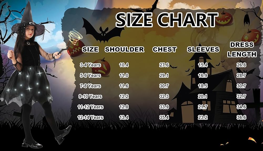 - مقاس دقيق: تأكد من ملاءمة ساحرة من خلال الرجوع إلى جدول المقاسات الدقيق الخاص بنا قبل الطلب، مما يجعل تجربة زي الساحرة الصغيرة الخاصة بك مبهجة للغاية.