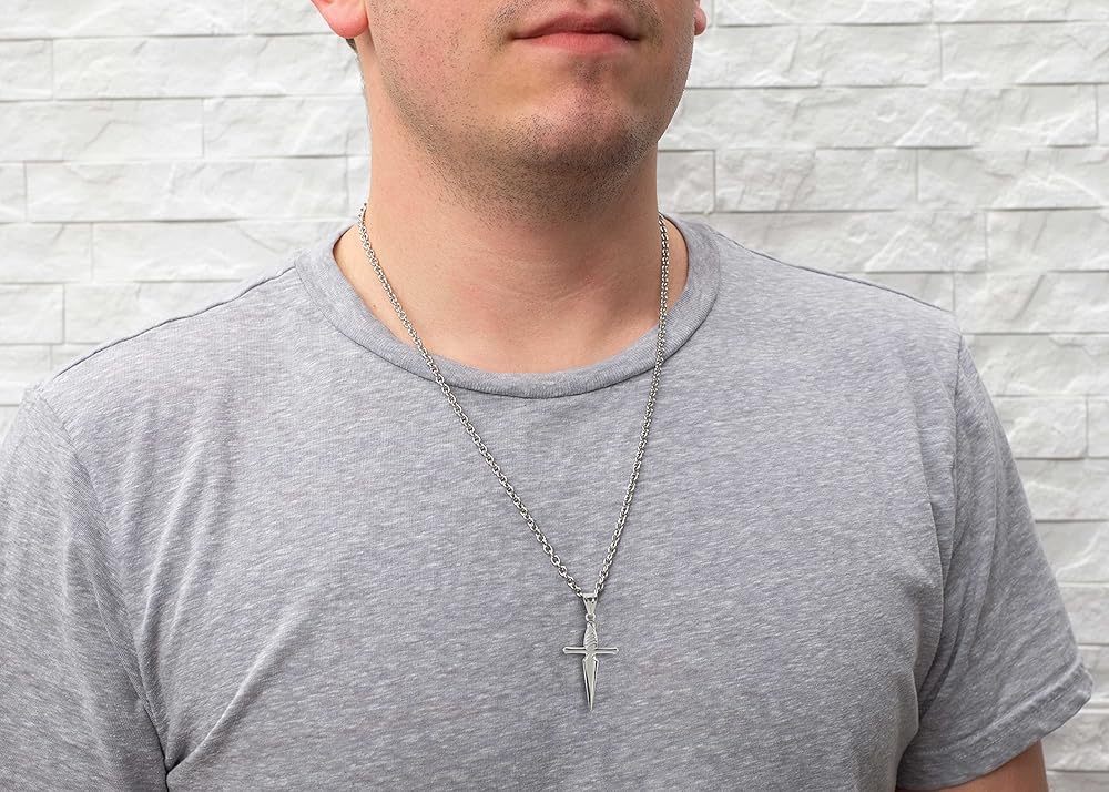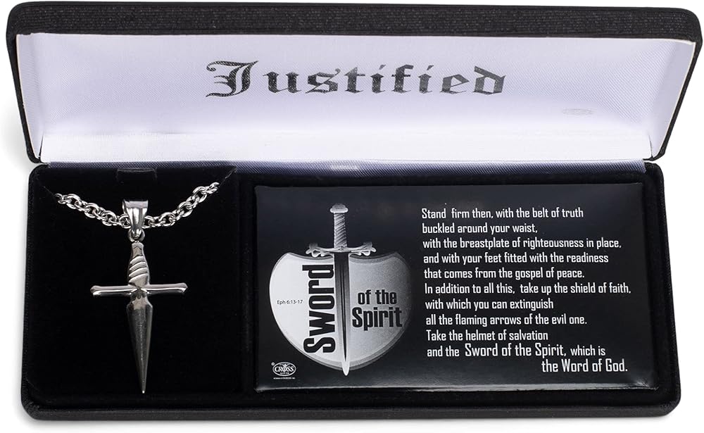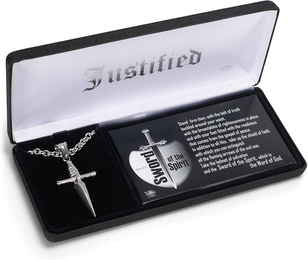 قلادة أنيقة تتميز سيف قلادة على شكل صليب مع حواف أنيقة ومقبض مضلع. تعمل هذه القلادة الجميلة كإكسسوار مثالي، وهي بمثابة تذكير مملوء بالإيمان كل يوم يتم ارتداؤه ، وتجعل إهدائها أمرًا سهلاً. تتميز بسلسلة فضية اللون مقاس 60.96 سم، مصنوعة من مواد معدنية عالية الجودة بلون فضي من الفولاذ المقاوم للصدأ. تصميم بسيط وأنيق مع قلادة يعطي هذه القلادة سحر وجذابة لمتابعي المسيح في حياتك. تحتوي على تعبئة واقية؛ جاهزة للإهداء
