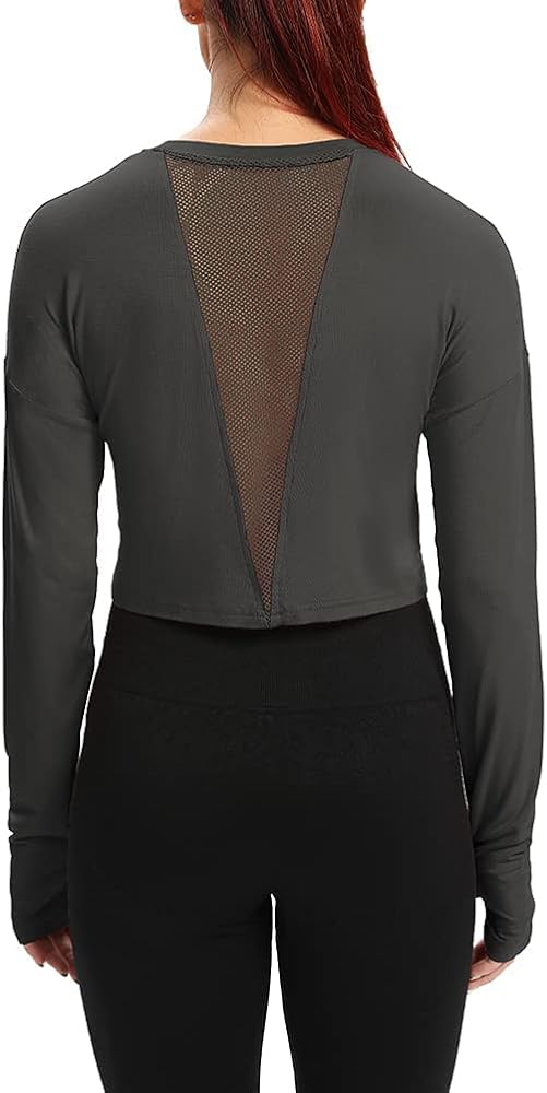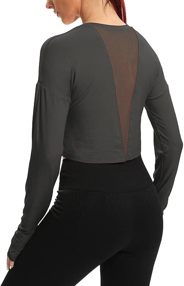 - يتميز القميص القصير بأكمام طويلة بفتحة للإبهام، وظهر شبكي ومقاس فضفاض، مما يجعله يبدو لطيفًا للتمرين أو كقميص كاجوال
