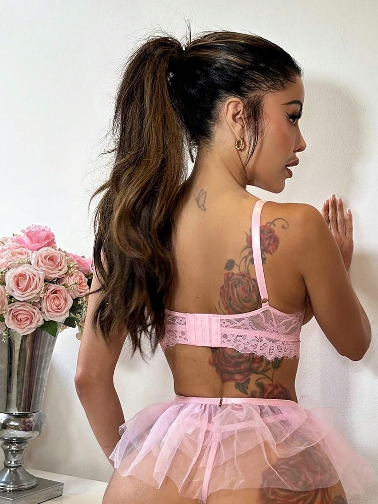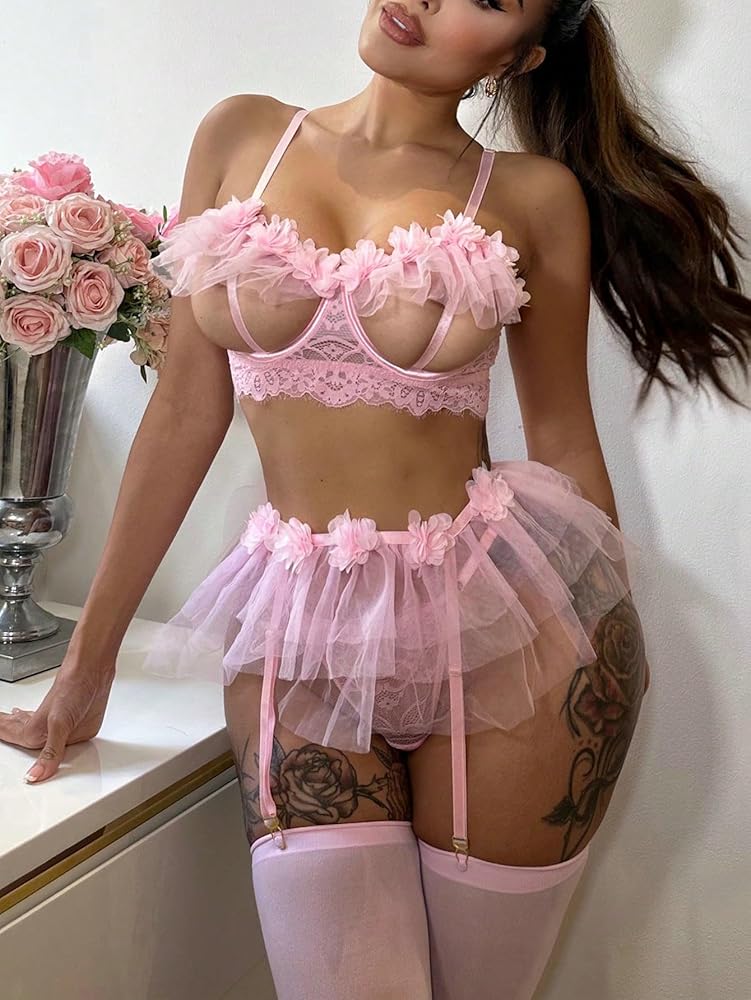 - المزايا: 5 قطع، زينة زهور، بدون أكمام، شبكي، دانتيل، زخرفة مكشكشة