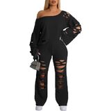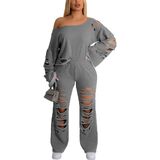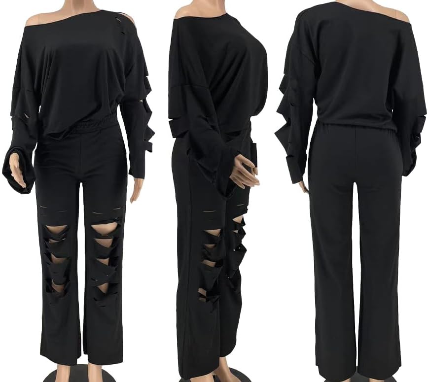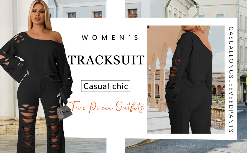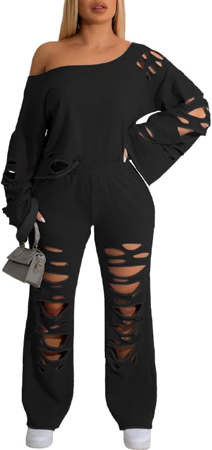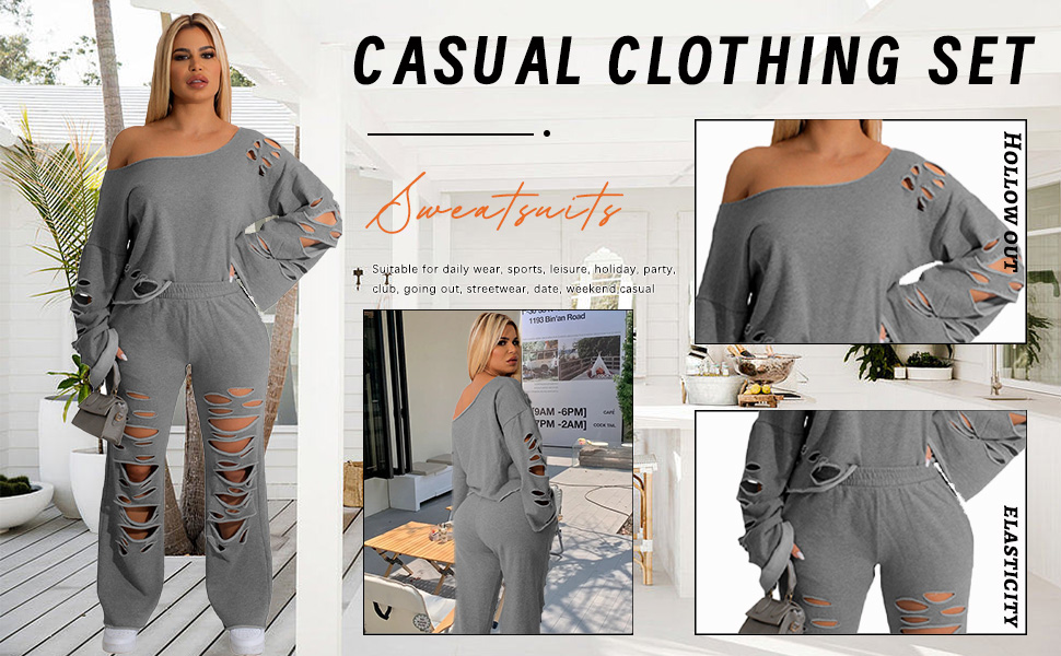 السمات: مجموعة من قطعتين، زي للاسترخاء أو قميص فضفاض مثير بأكتاف مائلة. كم طويل، فتحة ممزقة، بدون أكتاف، ساق واسعة، سراويل رياضية بخصر مرن، طراز هيب هوب