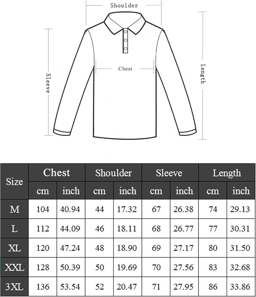 【مقاسات متعددة للاختيار】تحتوي قمصان البولو الرجالية طويلة الأكمام على خمسة مقاسات من المقاس M إلى المقاس 3XL. يتم قياس مقاس قميص بولو الرجالي طويل الأكمام يدويًا، وقد يكون هناك انحراف في نطاق 0.39-0.78 بوصة، يرجى التحقق من جدول المقاسات بعناية لشراء المقاس المناسب.