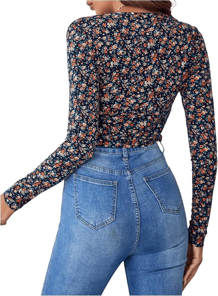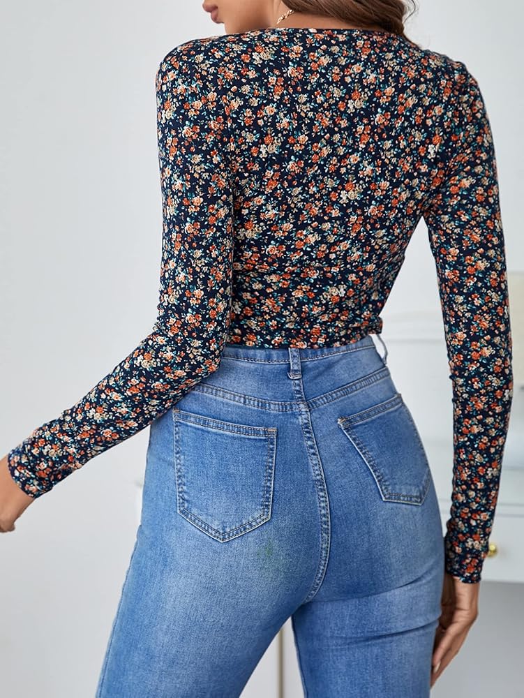 تي شيرت نسائي من SOLY HUX بطبعة زهور وأكمام طويلة ورقبة على شكل حرف V