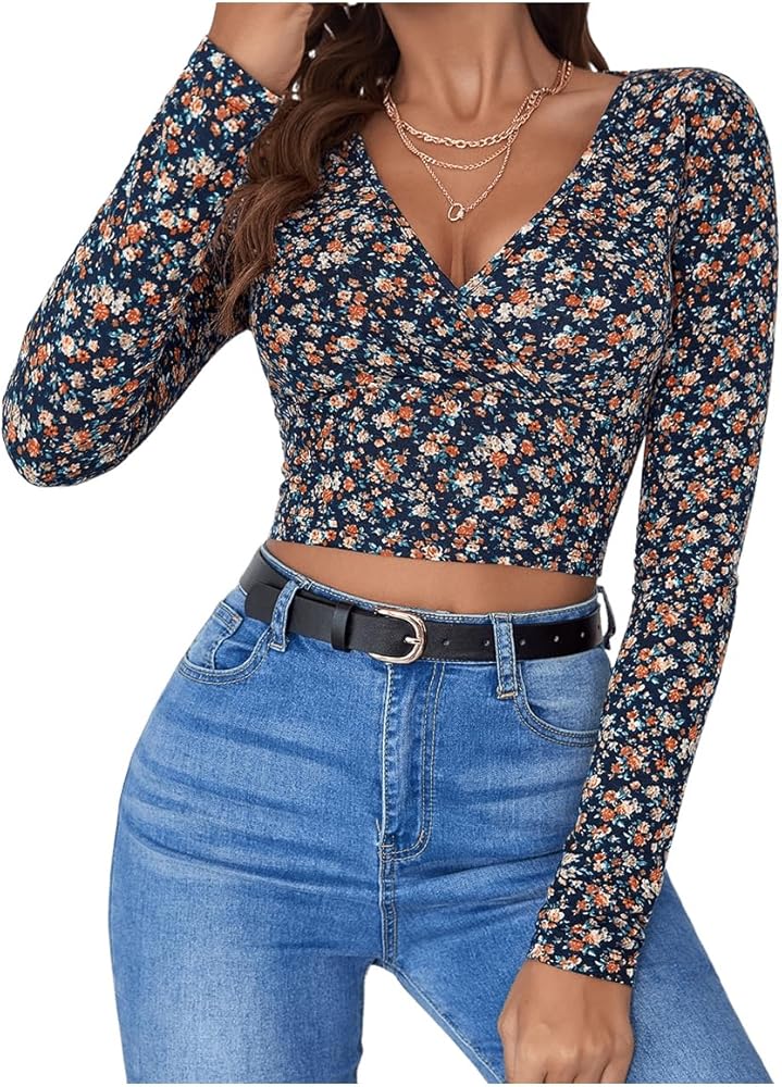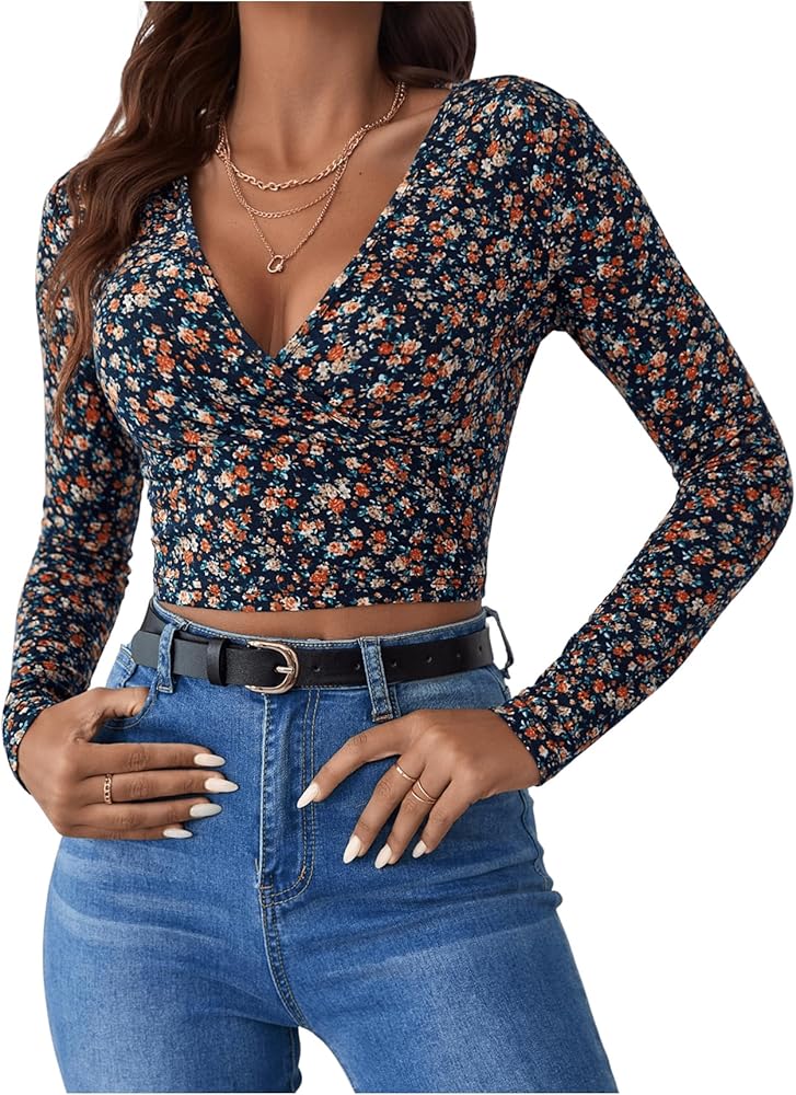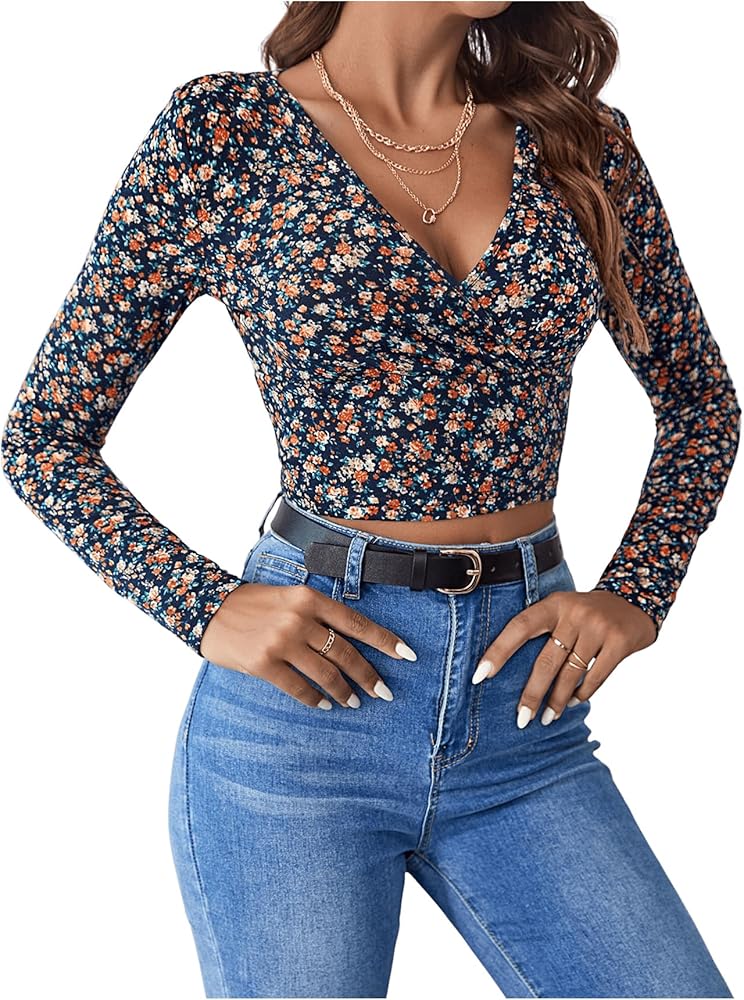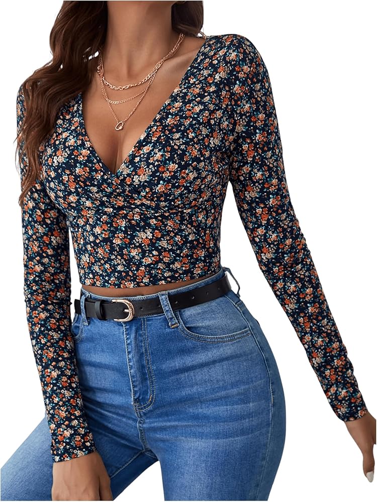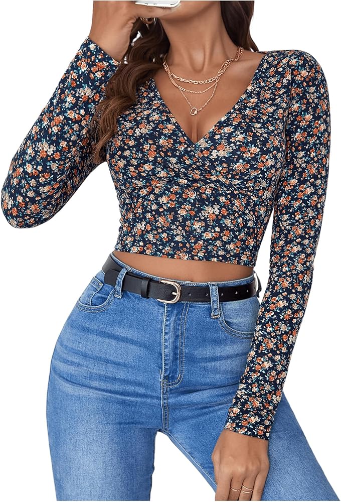 - المزايا: رقبة على شكل حرف V، كم طويل، طباعة زهور، ملفوف، مقاس نحيف، بلوفرات، عصري