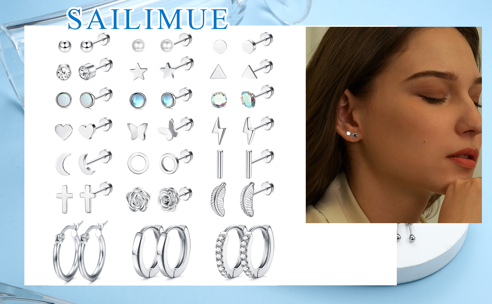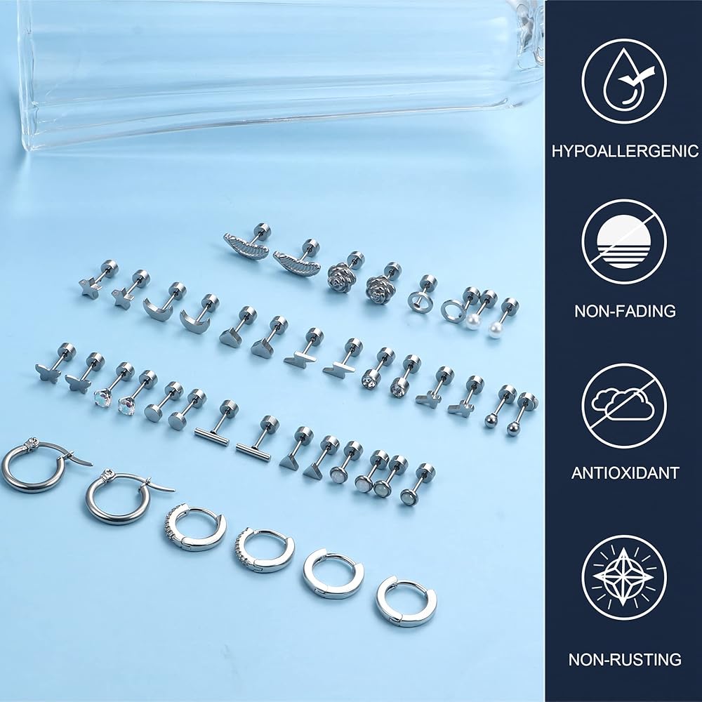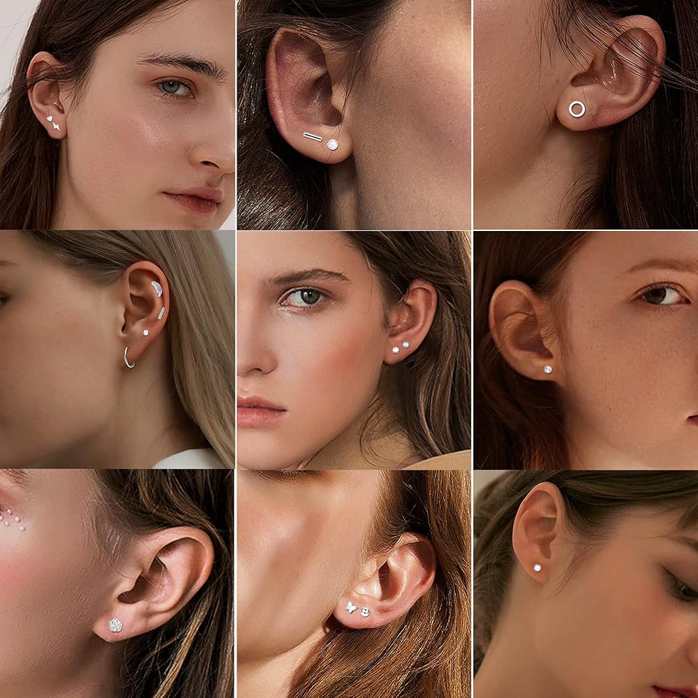【مجموعة أقراط خلفية مسطحة】تأتي مع 21 زوجًا من الأقراط المرصعة بالفولاذ الجراحي بتصميمات مختلفة، بما في ذلك 18 زوجًا من الأقراط ذات الظهر المسطح و3 أزواج من الأقراط الحلقية الغضروفية، يمكن ارتداؤها بمفردها أو في مكدسات، مما يمنحك متعة DIY، وتلبي احتياجات الارتداء المتنوعة.