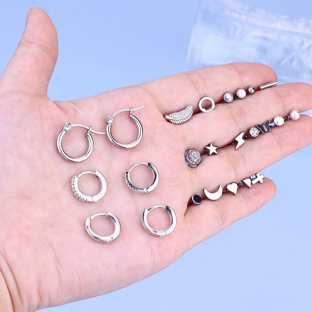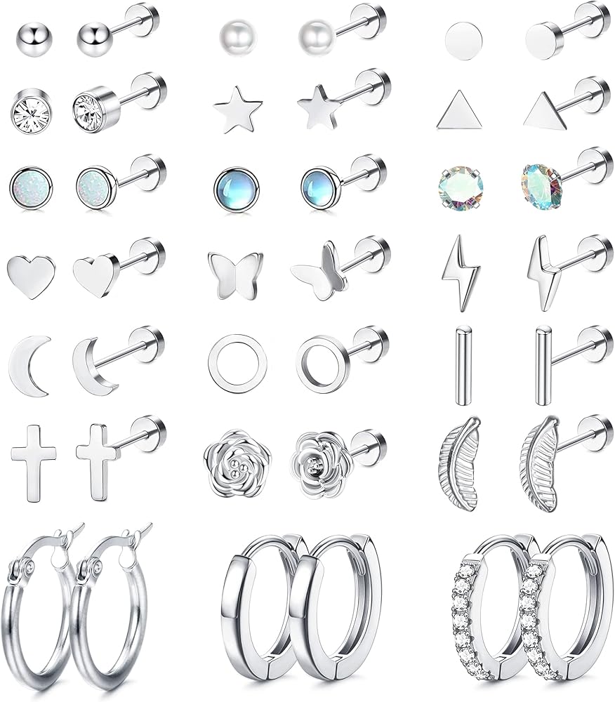 SAILIMUE 21 زوجًا من الأقراط الجراحية المصنوعة من الفولاذ بظهر مسطح للنساء والرجال 20 جرام أقراط الغضروف أقراط مسمارية لا تسبب الحساسية صغيرة على شكل قلب تشيكوسلوفاكيا ونجمة القمر وزهرة ورقة اللولب الزنمة Daith أقراط مسطحة للثقب المجوهرات