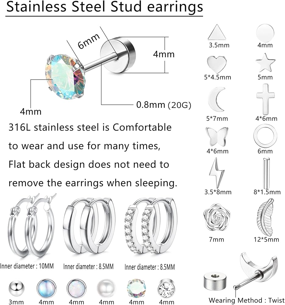 【حجم الأقراط الصغيرة】سمك الدبوس: 20 جم (0.8 مم)، طول العمود: 6 مم، حجم الظهر المسطح: 4 مم، حجم الزركونيا المكعب/العقيق: 4 مم، حجم القمر/النجمة: 5 مم، قطر الطوق الداخلي: 8.5/10 مم، الحجم العادي يمكن استخدامها كأقراط غضروفية، أو مجوهرات ثقب حلزونية، أو مجوهرات تراجوس، أو مجوهرات ثقب دايث.