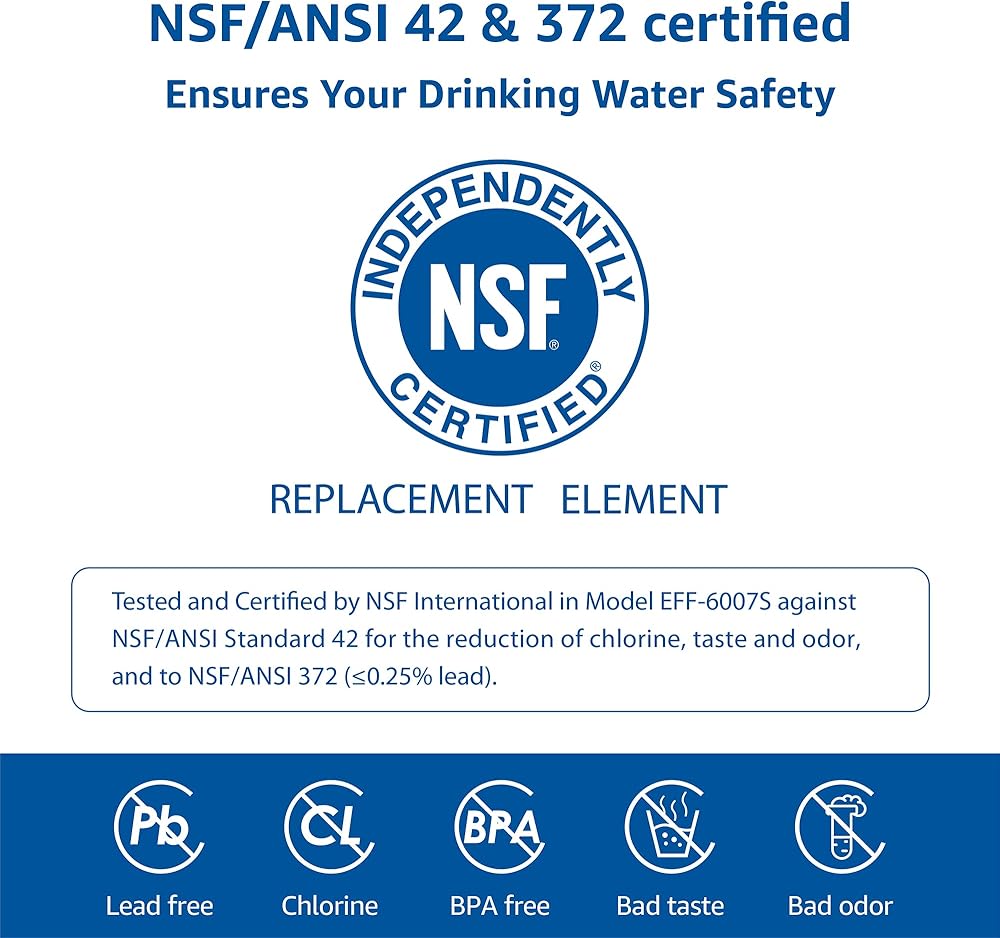 مادة فلتر ممتازة: اختارت شركة Waterspecialist غلاف فلتر خالٍ من مادة BPA وصالح للطعام واجتاز شهادة NSF 372 للترشيح الخالي من الرصاص. نحن نعتمد أيضًا كتلة كربون قشرة جوز الهند الطبيعية بنسبة 100% والتي تحتوي على مساحة سطحية أكبر ومسام دقيقة أكثر من كتلة الكربون الرديئة.