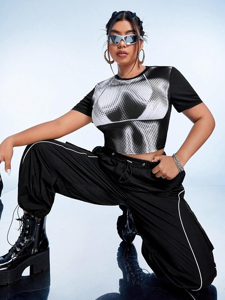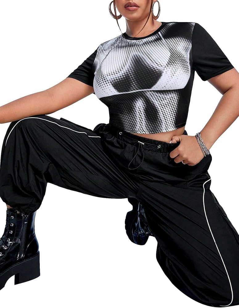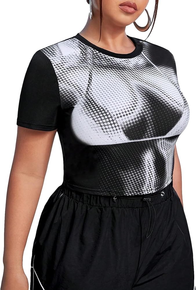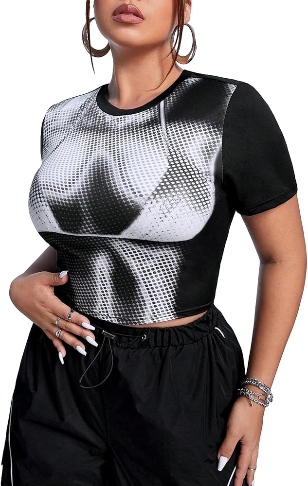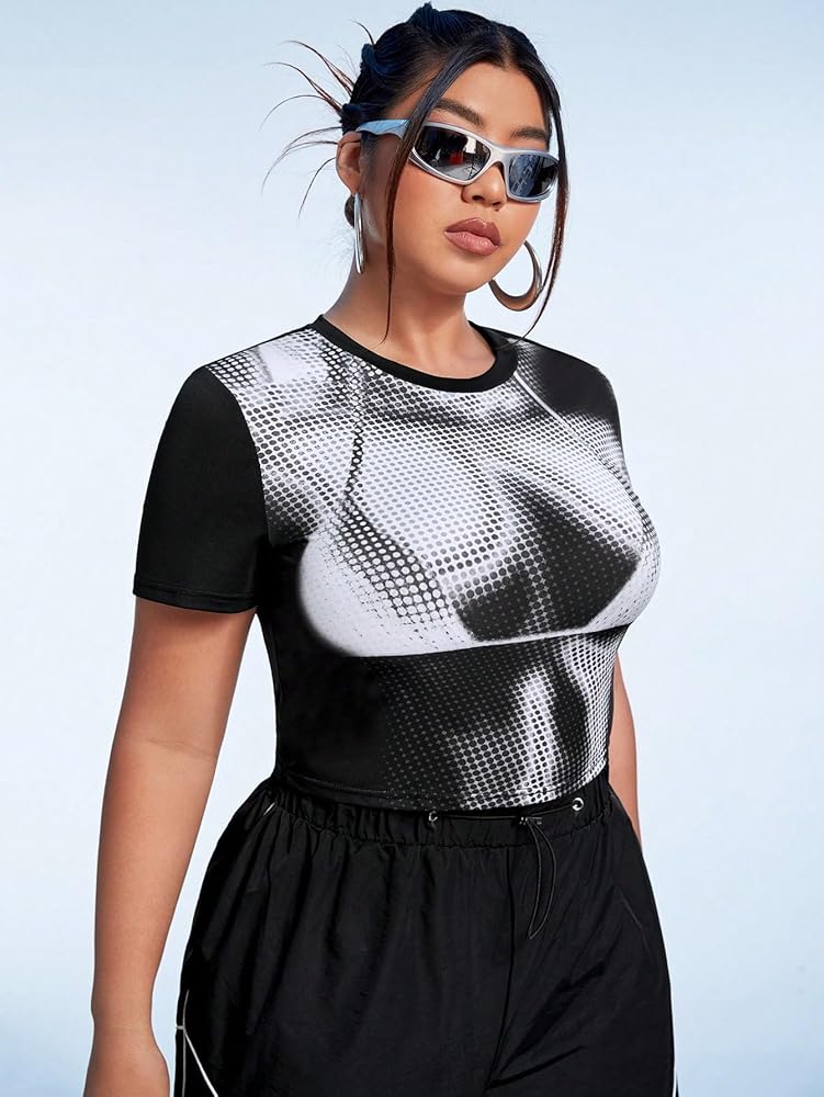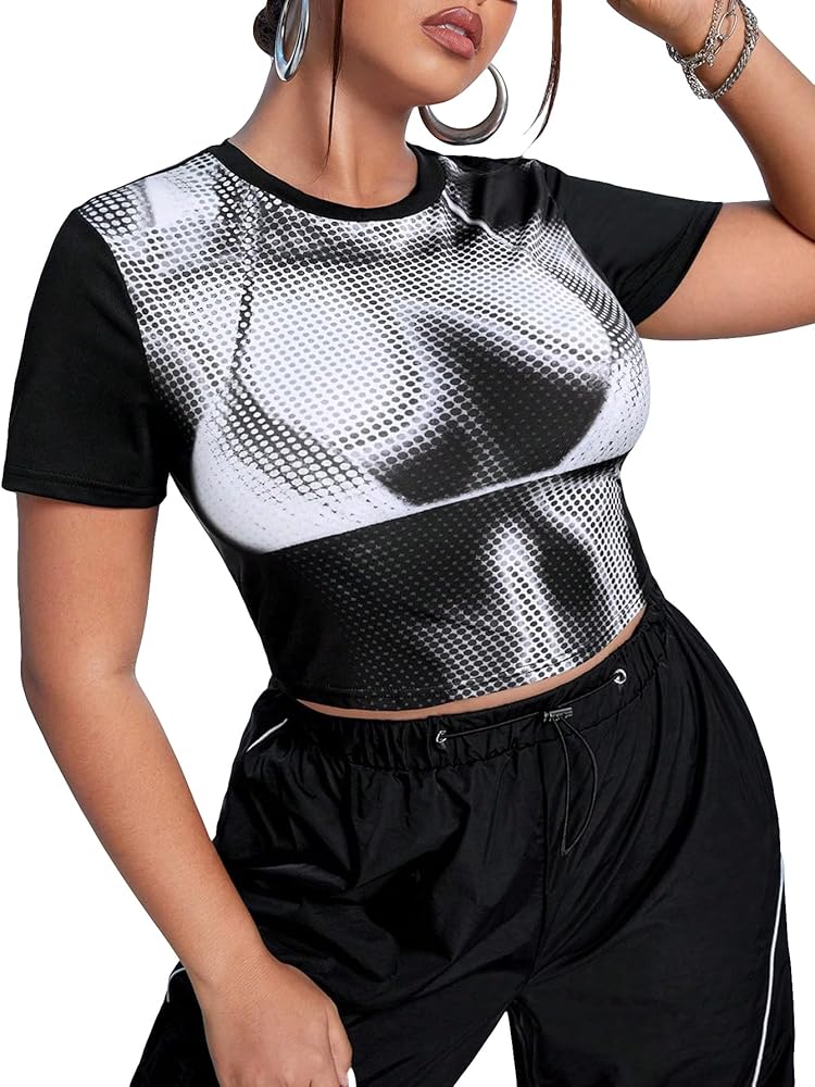 تي شيرت نسائي من GORGLITTER ذو طباعة جرافيكية قصيرة وأكمام قصيرة ورقبة دائرية