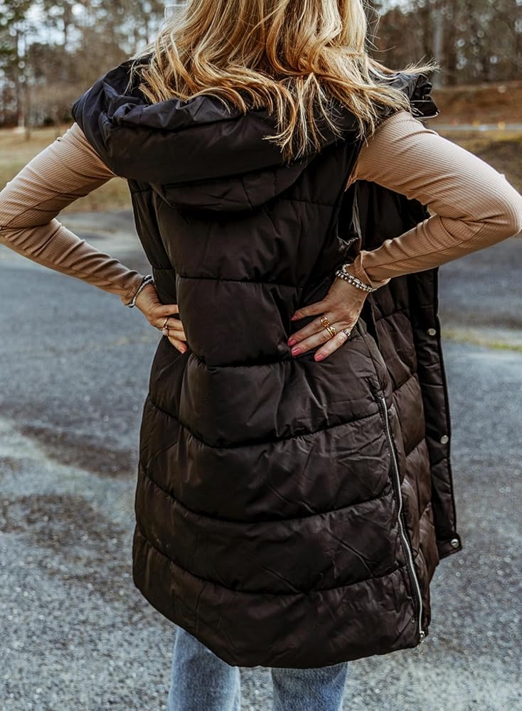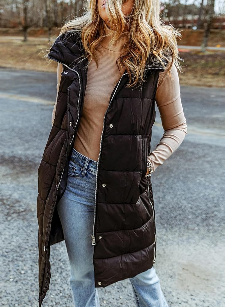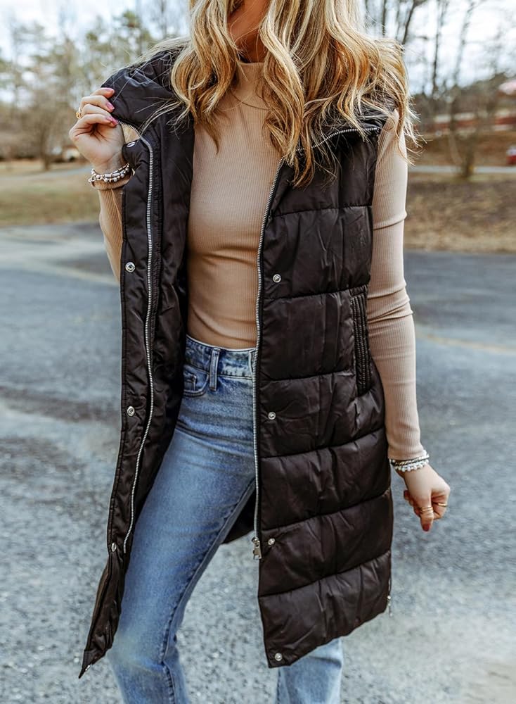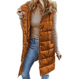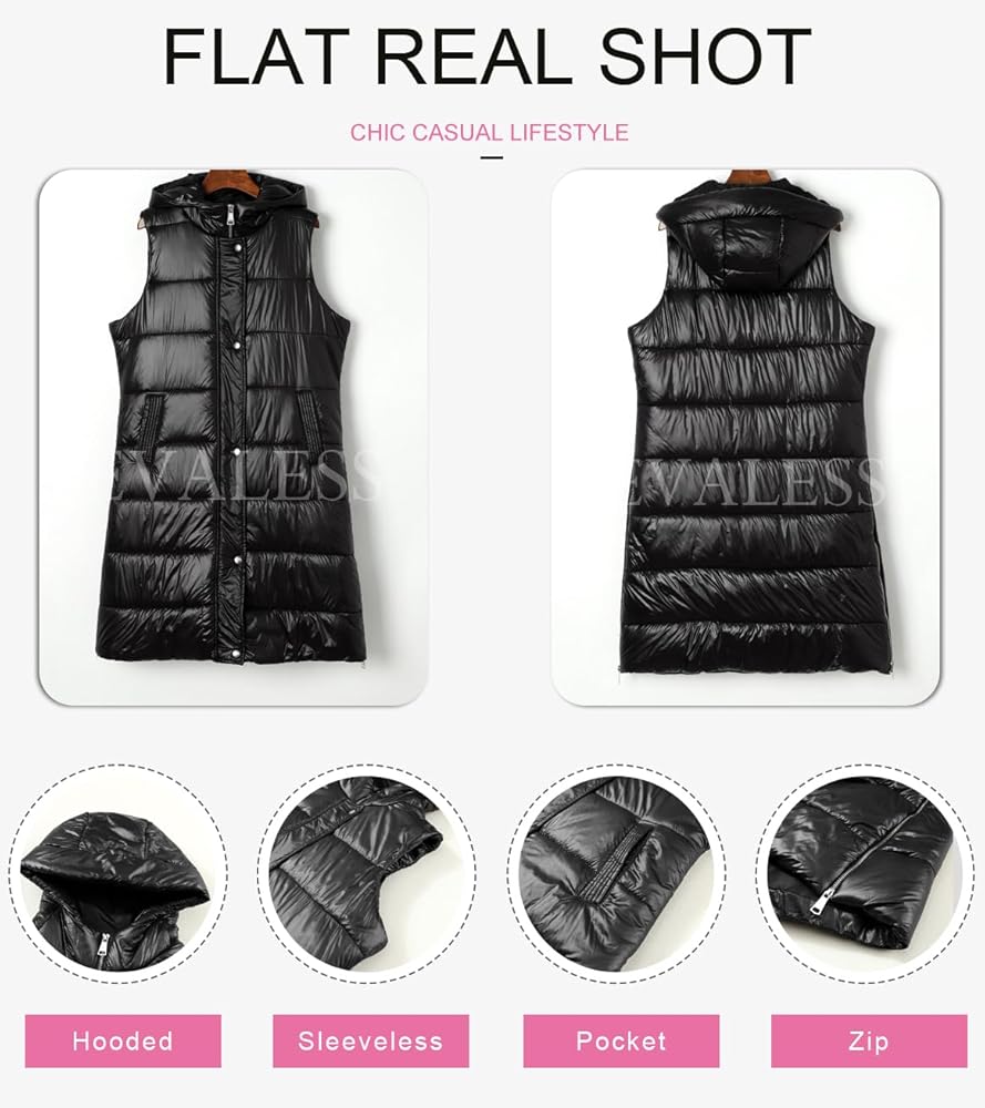 سترة منتفخة طويلة للنساء من EVALESS مبطنة بقلنسوة بدون أكمام مع سحاب للأسفل سترة شتوية دافئة خفيفة الوزن معطف جيليه ملابس خارجية