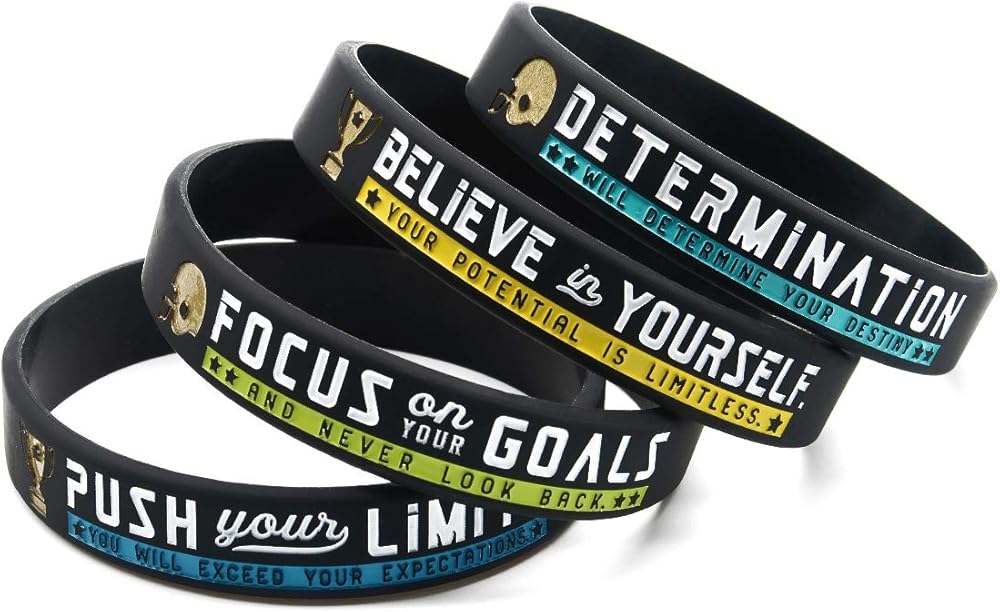 "استلهم من كلمات التشجيع مع هذه المجموعة المكونة من 12 قطعة من الأساور لمحبي كرة القدم والرياضيين. مريحة وسهلة الارتداء، هذه الأساور متعددة الاستخدامات ستناسب نمط حياتك النشط وتبقيك متحفزاً. تتكون هذه العبوة من 4 تصميمات جريئة (3 قطع لكل منها) مع الاقتباس: "ادفع حدودك"، "ثق بنفسك"، و"ركز على أهدافك"، و"حدد". يبلغ محيط كل سوار ملون 20.32 سم ويمكن أن يناسب أي مقاس معصم له ولها. مصنوعة من مطاط السيليكون، لذلك يمكنك تمديدها قليلاً للحصول على ملاءمة محكمة. مثالي لمحبي الرياضة من جميع الأعمار، ويمكن ارتداؤه كل يوم للحفاظ على إلهامك وروح فريقك مرتفعة. يمكنك إعطاؤها أثناء الأحداث الرياضية أو الحفلات ذات الطابع الرياضي أو كعناصر إضافية في حقائبك."