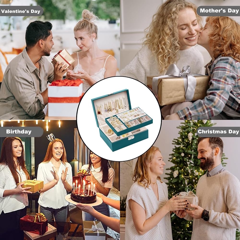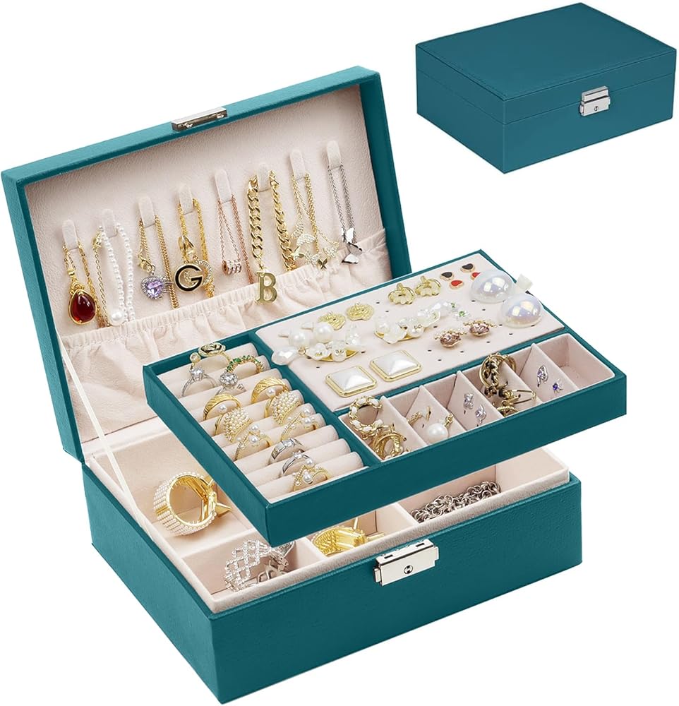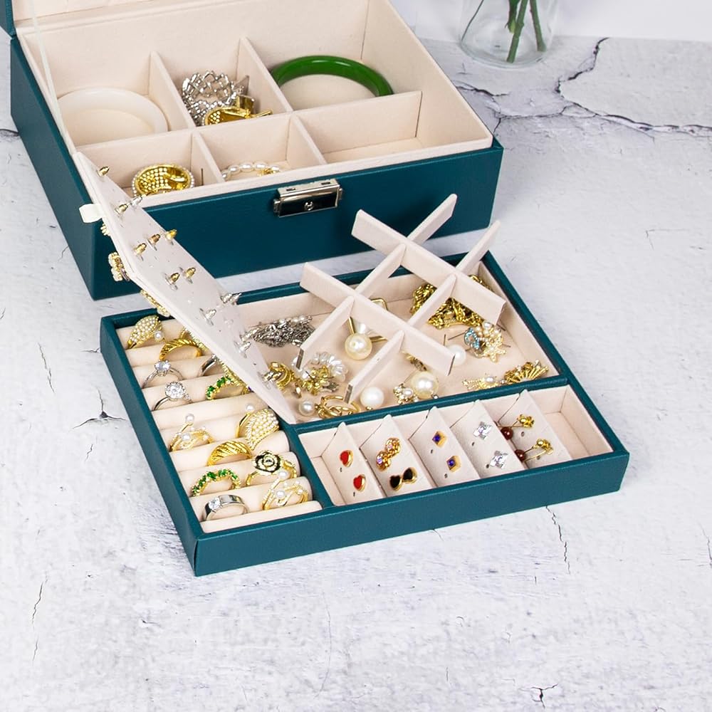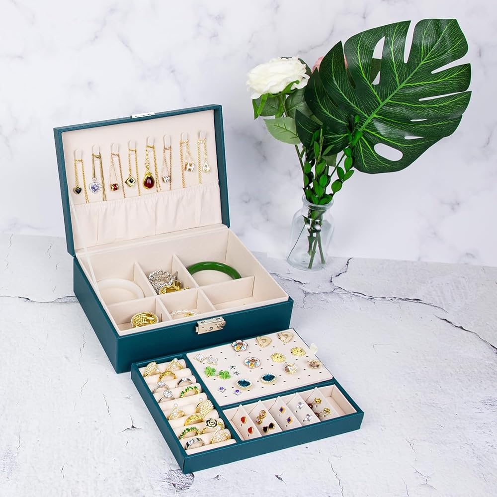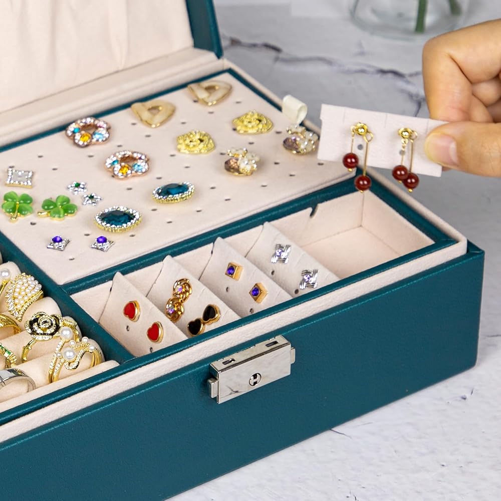 صندوق منظم مجوهرات للنساء والفتيات من سيكارون، حافظة منظم مجوهرات من طبقتين من جلد البولي يوريثين ببطانة ناعمة مع قفل للخواتم والاقراط والقلائد والاساور، اخضر