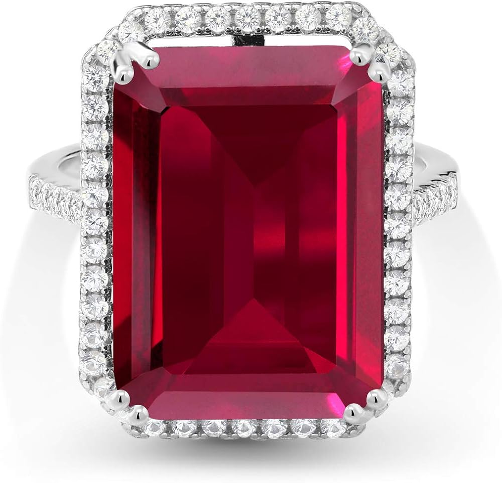 خاتم خطوبة من الفضة الإسترليني عيار 925 من Gem Stone King مصنوع من الياقوت الأحمر للنساء (1.50 قيراط، قطع الزمرد 18 × 13 مم، متوفر بمقاس 5، 6، 7، 8، 9)