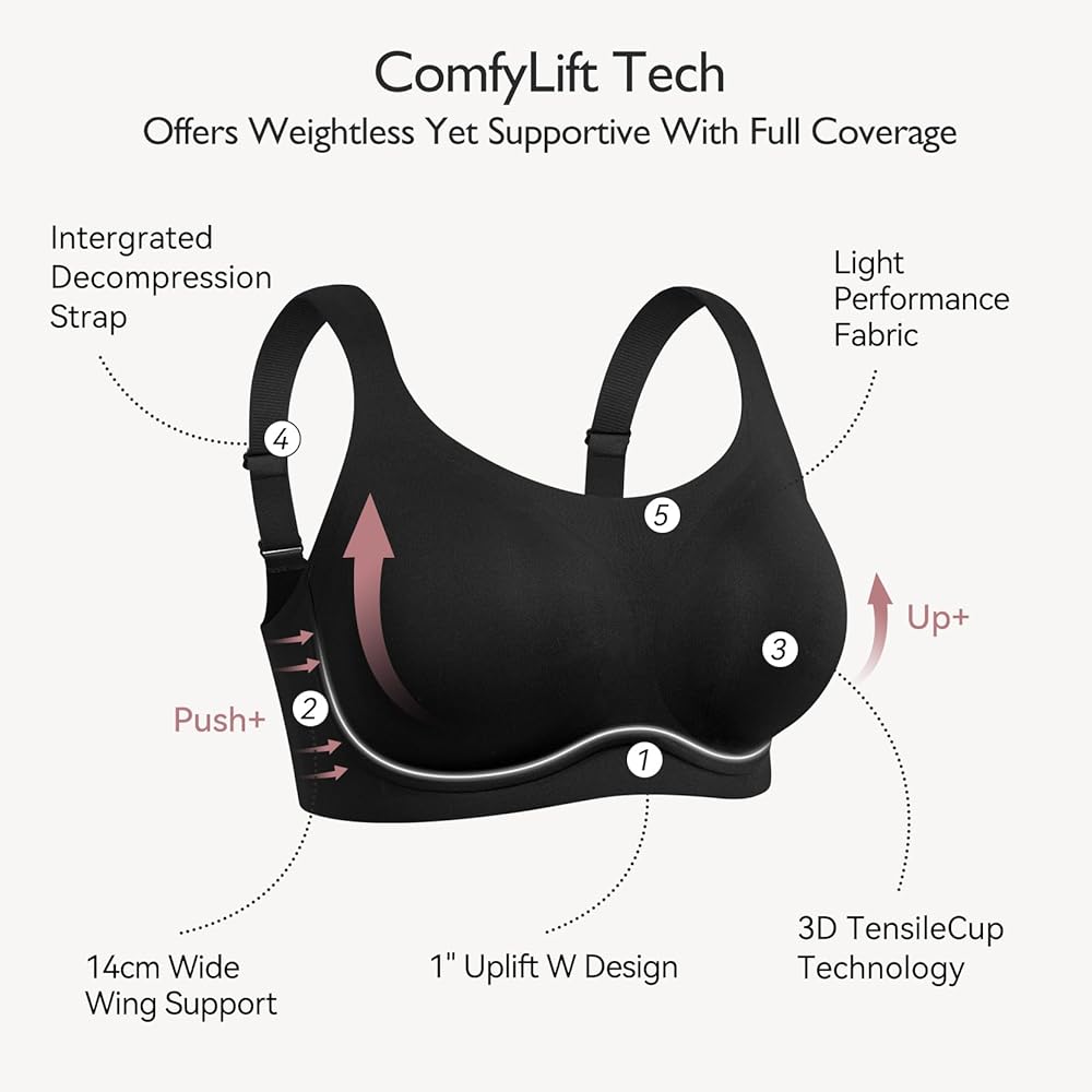 【حمالة صدر لاسلكية مع دعم ورفع】تستخدم تقنية ComfyLift Tech هيكل دعم W وأجنحة أوسع لرفع صدرك بشكل طبيعي حتى 1 بوصة.