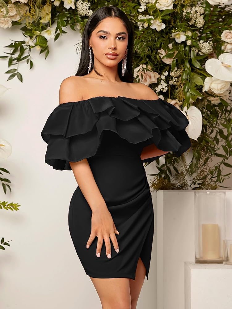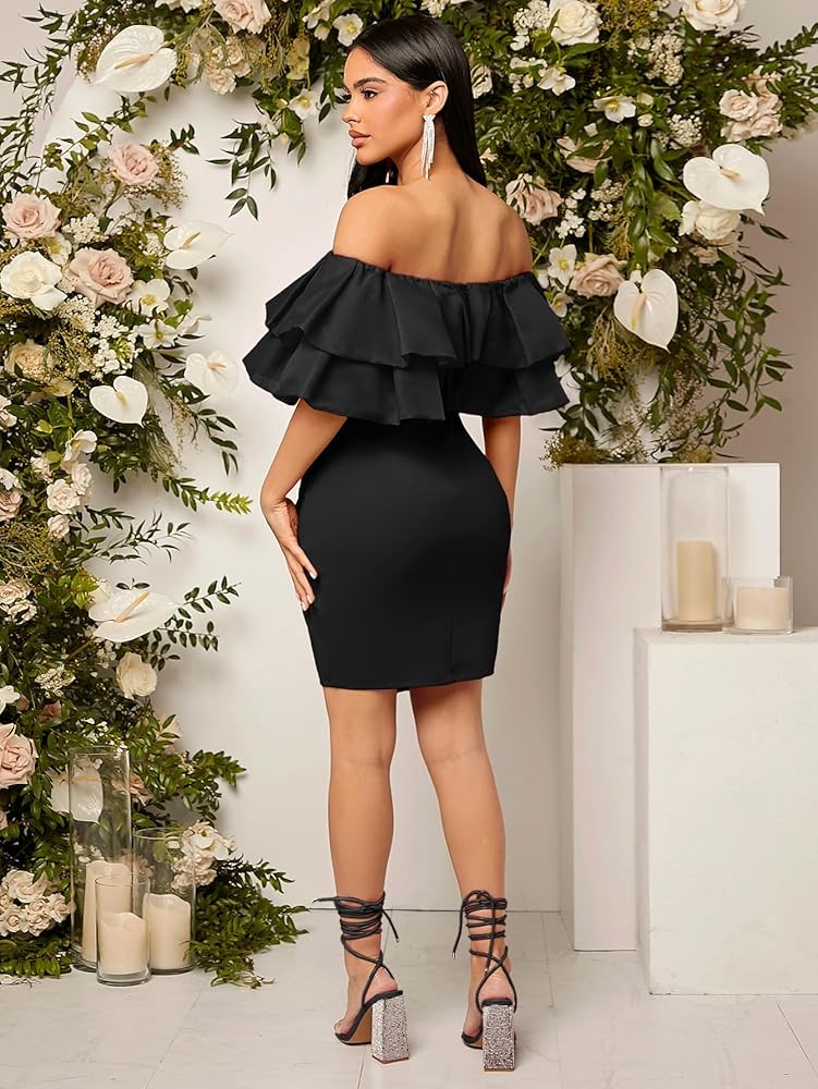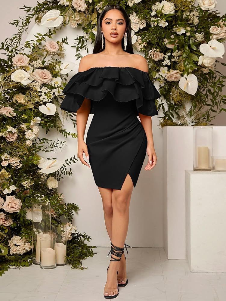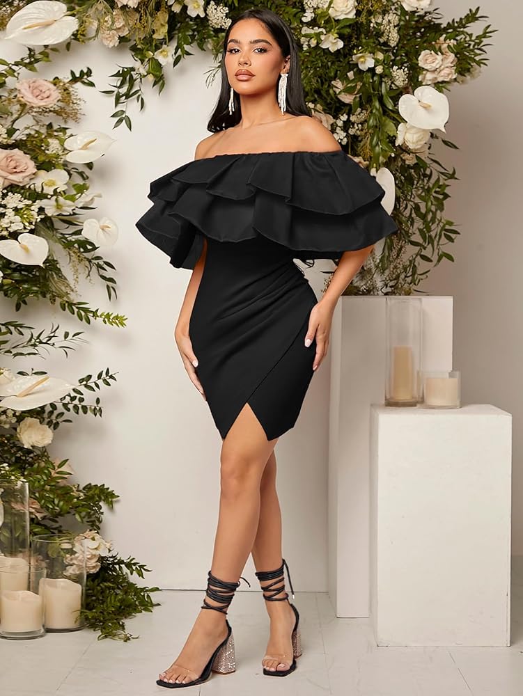 فستان WDIRARA نسائي بدون أكتاف ذو طبقات نصف كم مكشكش وخصر مرتفع وحاشية مقسمة