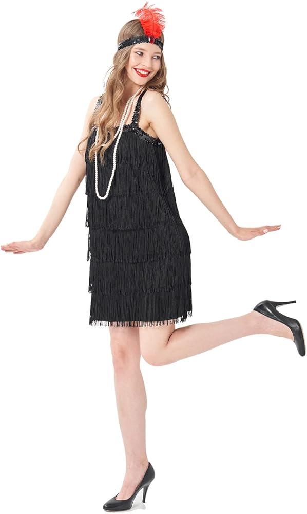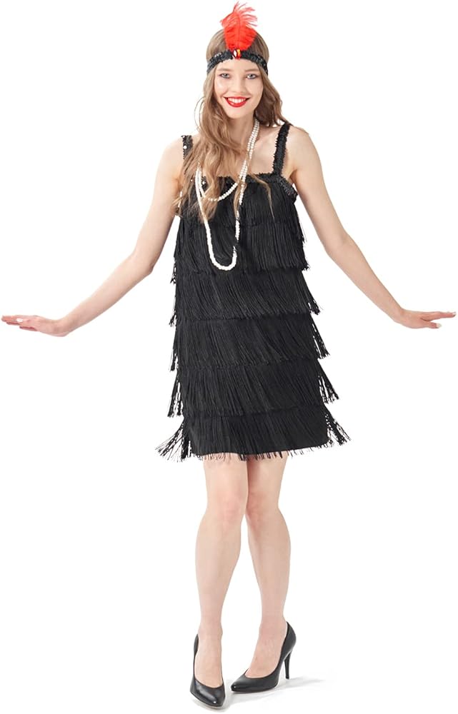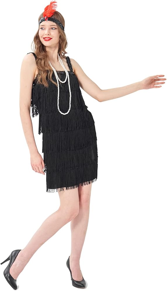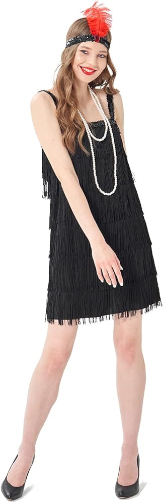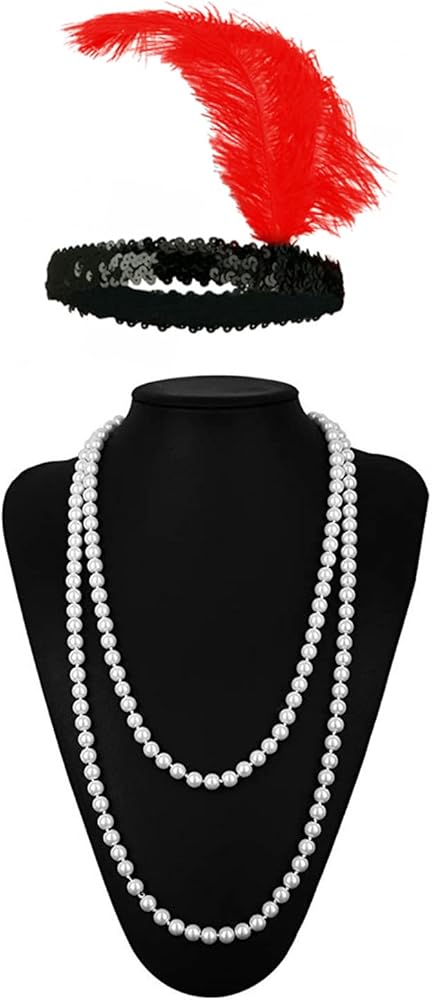 • العبوة: 3 قطع تتضمن فستان فلابر من العشرينيات وعصابة رأس من الريش وقلادة من اللؤلؤ المقلد.