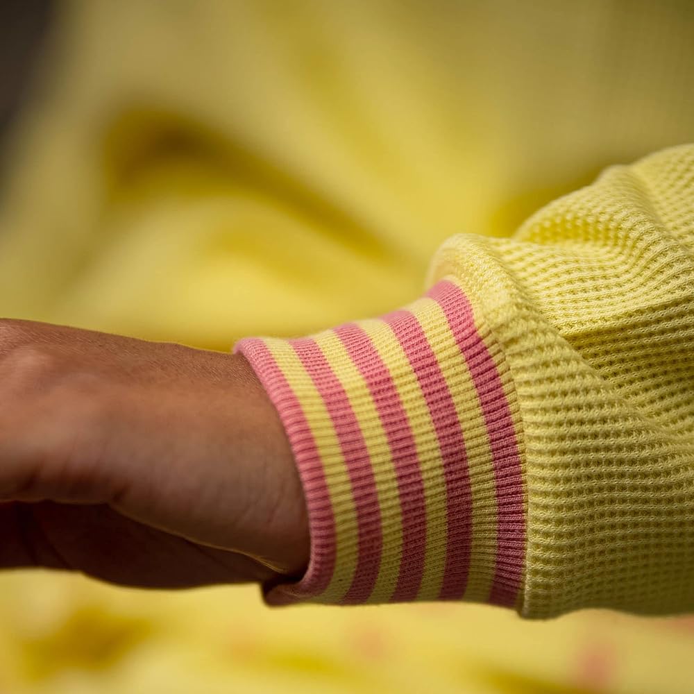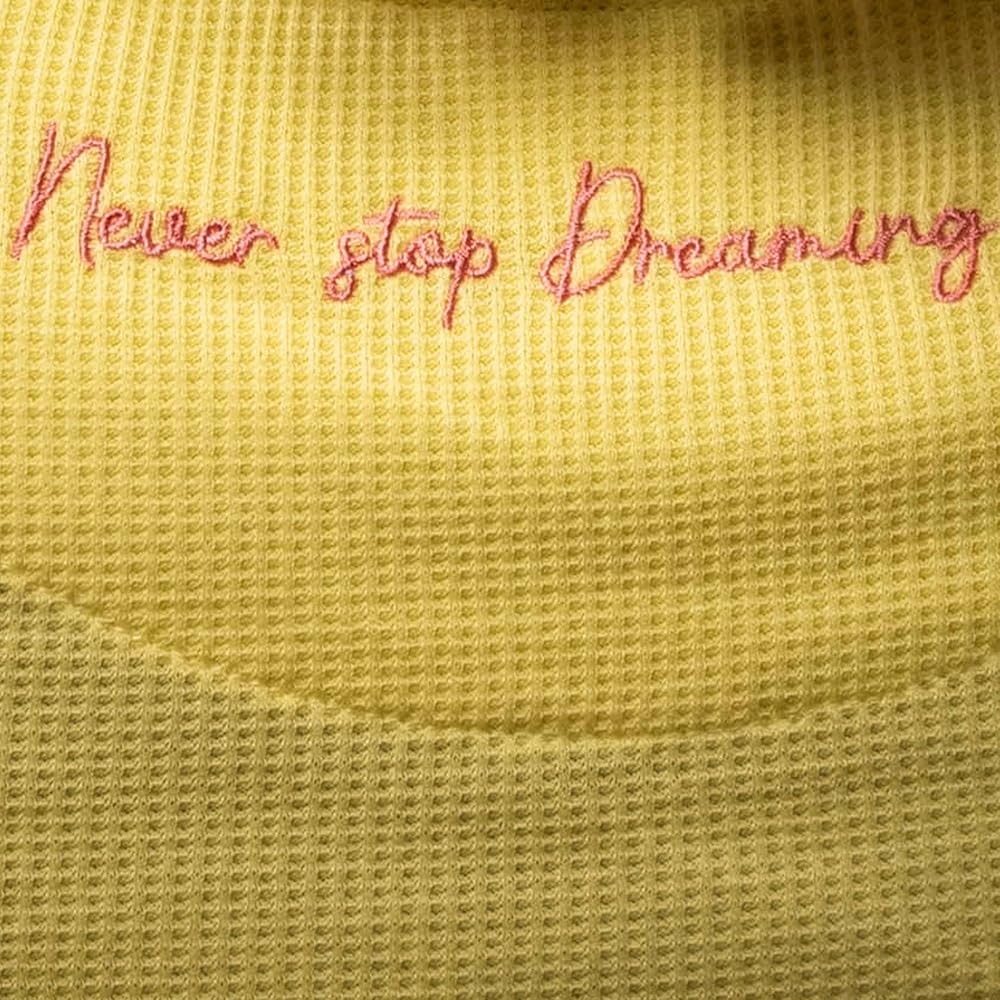 مع رقبة مضلعة مخططة وجيب مطبوع عليه Winnie The Pooh والأصدقاء على التي شيرت، مع حزام خصر مطاطي مطابق على البنطلون. تفاصيل مطرزة على الرقبة الخلفية مكتوب عليها "Never Stop Dreaming" تكمل هذه الجاماي المثالية لأولئك الذين يحبون الغمس في وعاء الصيد!