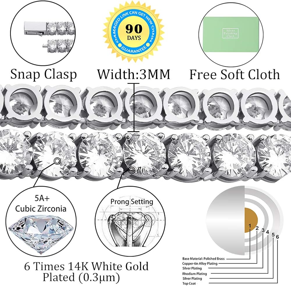 • مجوهرات لامعة متينة: نعتقد أن أفضل طريقة لمعايير المجوهرات هي المواد المستخدمة والمدة التي تدوم طويلاً. بالنسبة للمعادن، قمنا بطلاء الذهب الحقيقي عيار 14 قيراط والذهب الأبيض بالكهرباء لمدة 6 مرات (0.3 ميكرومتر) على النحاس المصقول البيئي اللامع. بالنسبة للأحجار، اخترنا بشكل متقن زركون مكعب دائري الشكل 5A+ والذي يكون أقل شوائبًا ويتألق بشكل مماثل مع الماس الحقيقي. إذا احتفظت بسلسلة التنس الماسية بعناية، فلن تتلاشى لمدة 3 سنوات على الأقل وحتى إلى الأبد.