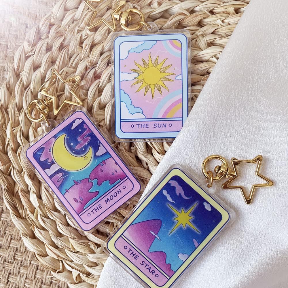 3PCS بطاقة التارو الاكريليك سلسلة المفاتيح، الشمس القمر النجوم التارو، من جانب سحر kawaii الفن الجماليات حقيبة الظهر سلسلة المفاتيح للفتيات، النساء محافظ سلسلة المفاتيح السيارة، حقيبة الظهر سحر الهدايا