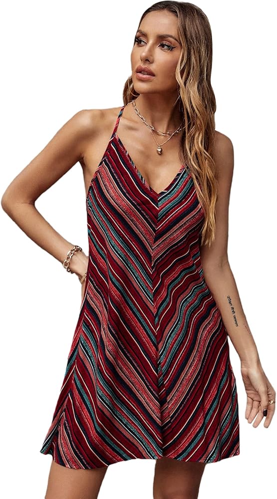 - السمات: طباعة شيفرون، حزام سباغيتي، بدون أكمام، رقبة على شكل حرف V، فستان صيفي، عصري