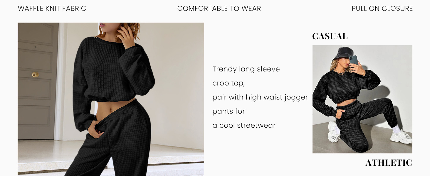 يمكن ارتداؤها معًا أو بشكل منفصل. يمكن ارتداء الجزء العلوي مع الجينز والأحذية الرياضية لمظهر كاجوال، أو يمكن ارتداء المجموعة بأكملها مع معطف في الخريف والشتاء، عصري ودافئ.
