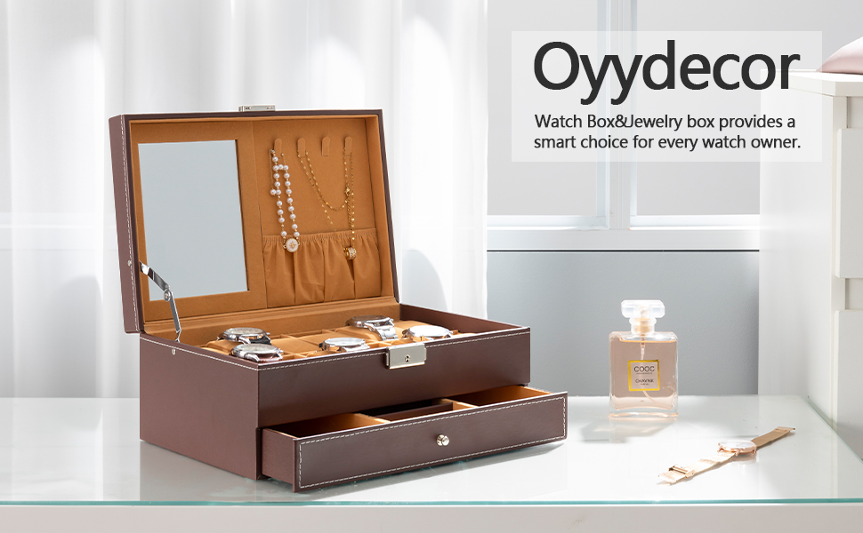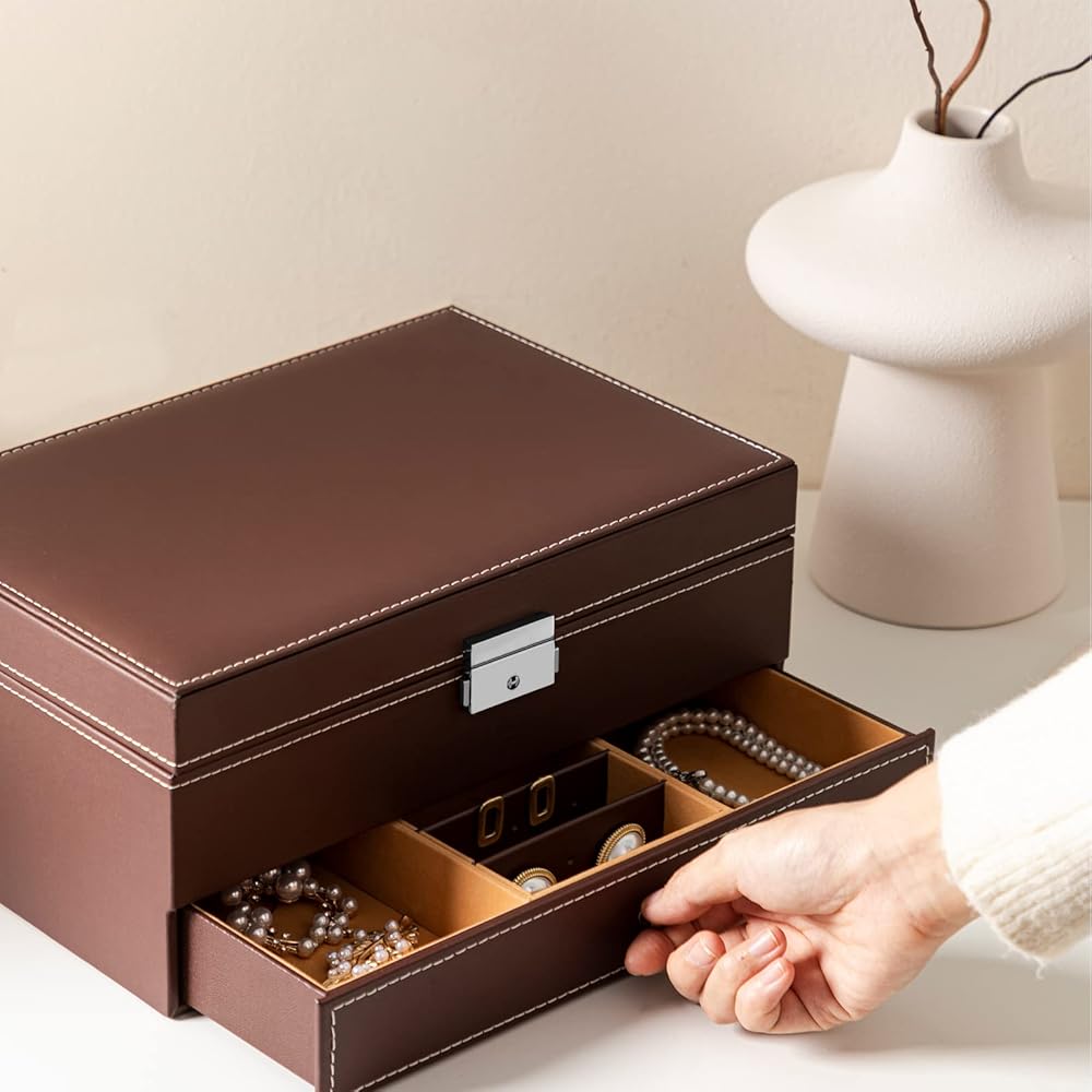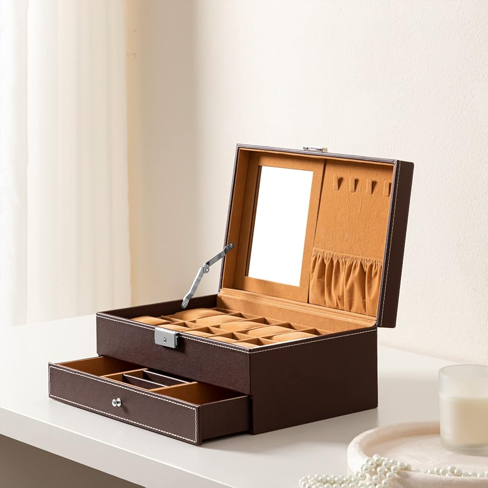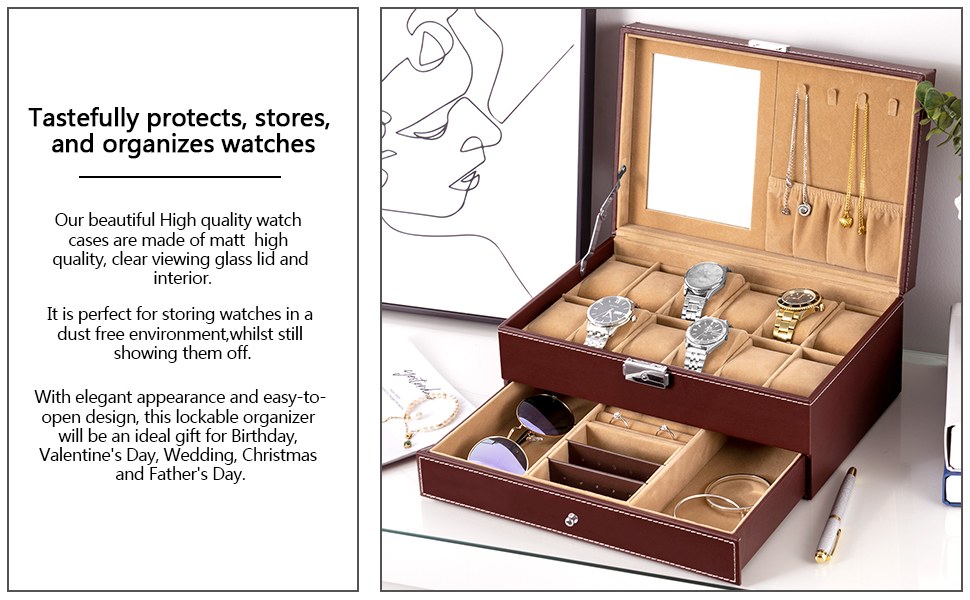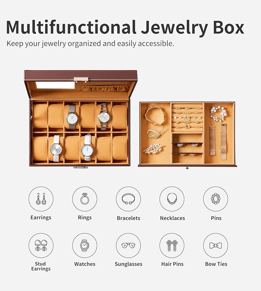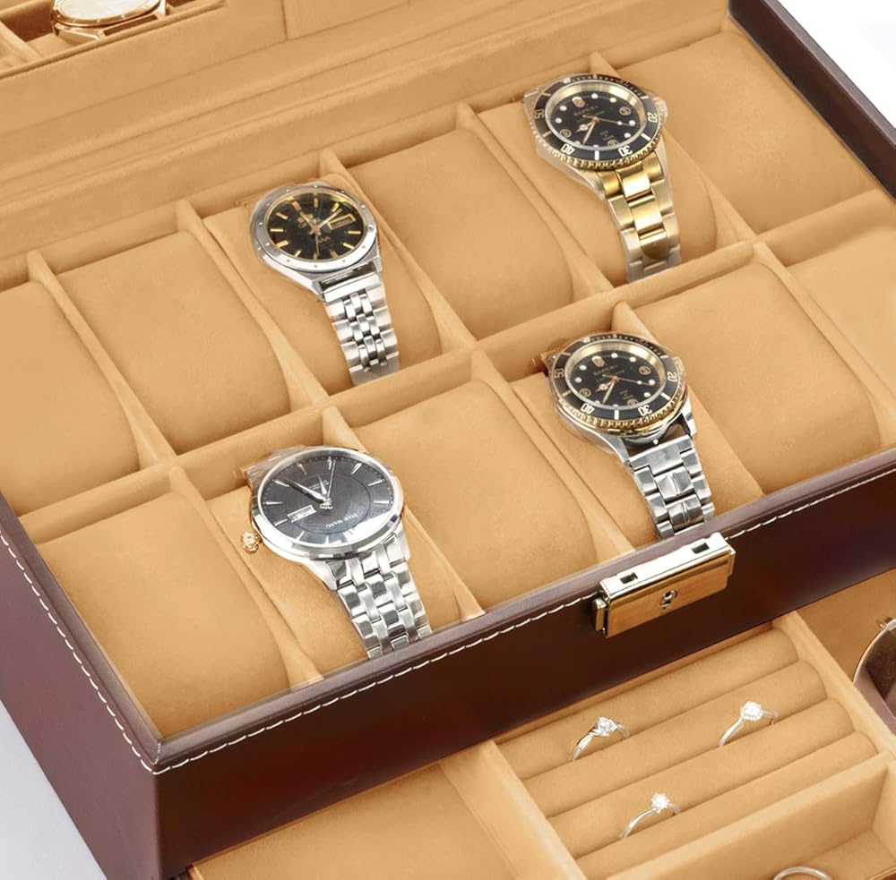 طبقة مزدوجة: في الطبقة العليا من علبة المجوهرات، يوجد 12 فتحة للساعة مع وسائد مخملية قابلة للإزالة. وفي الطبقة السفلية، توجد مساحة مناسبة كافية لأزرار الأكمام والقلائد والأساور والأقراط والدبابيس وربطات العنق والنظارات الشمسية وأي مجوهرات وممتلكات أخرى.