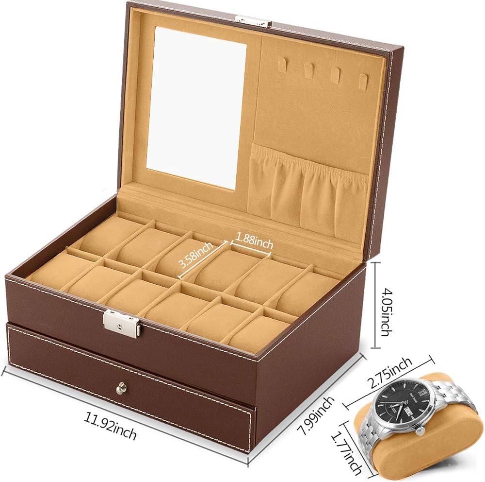 تصميم فريد من نوعه: الحجم: 11.92 × 7.99 × 5.24 بوصة. درزات متقنة الصنع، تصميم داخلي مصقول، مفصلات فعلية ناعمة، صندوق الساعة المصمم جيدًا هذا متين وأنيق. يمكن أن يتناسب اللون والتصميم الأنيق مع خزانة الملابس مثالي. يجب أن يكون رجلك سعيدًا جدًا عند تلقي مثل هذه الهدية اللطيفة في عيد الميلاد أو عيد الميلاد. رائعة وراقية. وسهلة التنظيف. تحتاج فقط إلى مسح منظم علبة العرض بقطعة قماش.