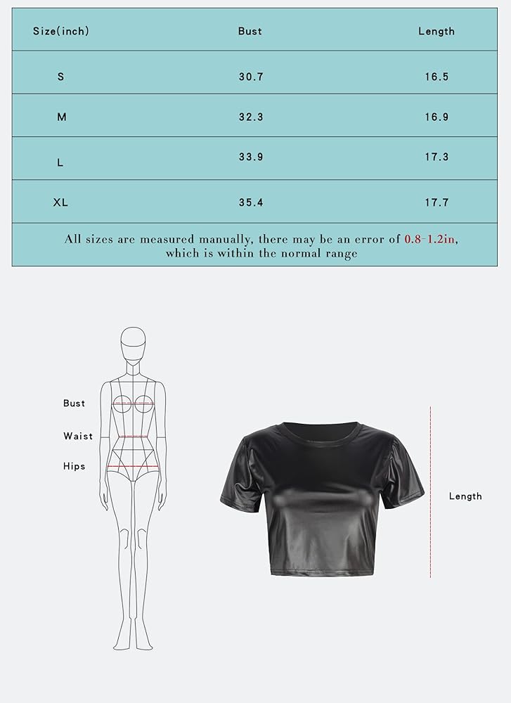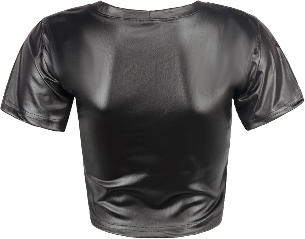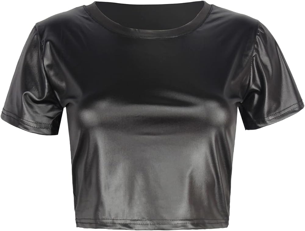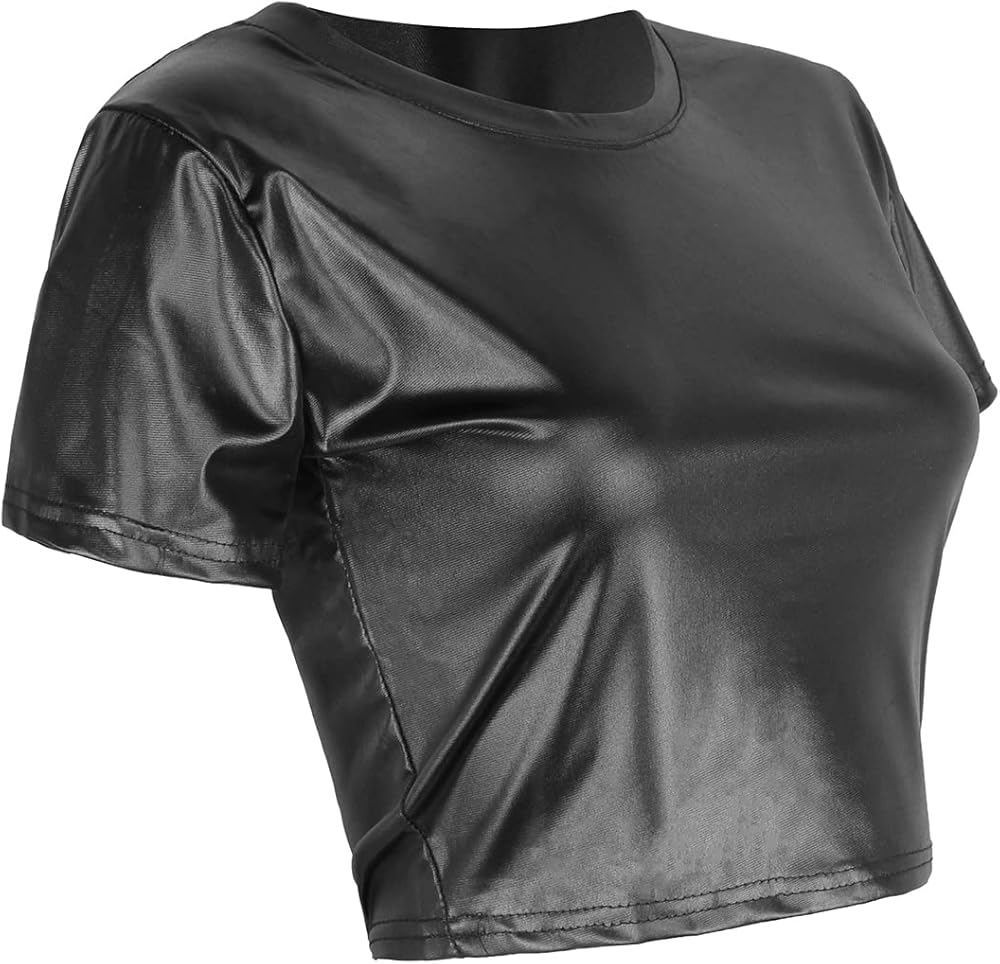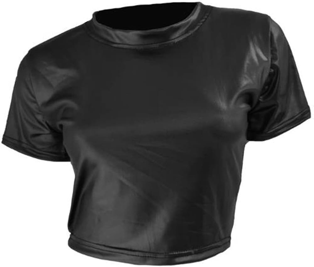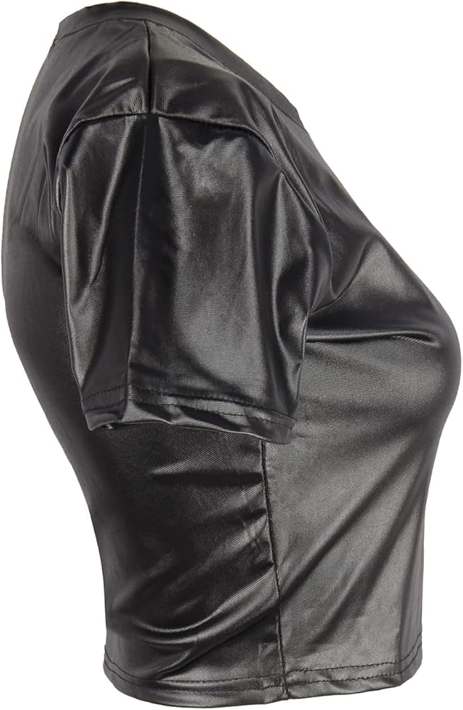 تي شيرت Berylzz نسائي ذو مظهر جلدي ورقبة دائرية وقصة ضيقة ومطاطة وبنمط قصير وصلب