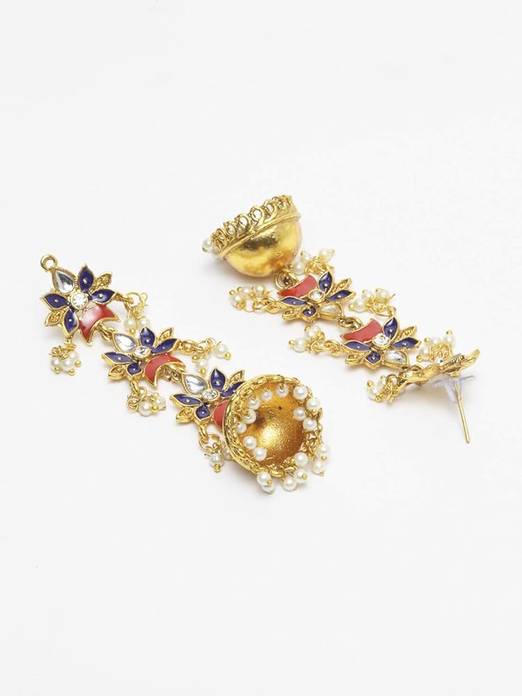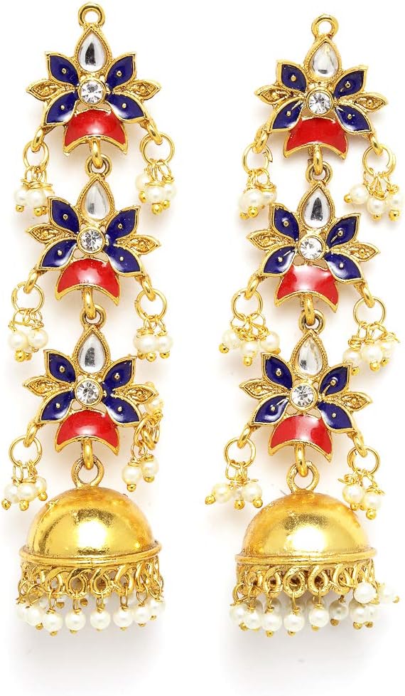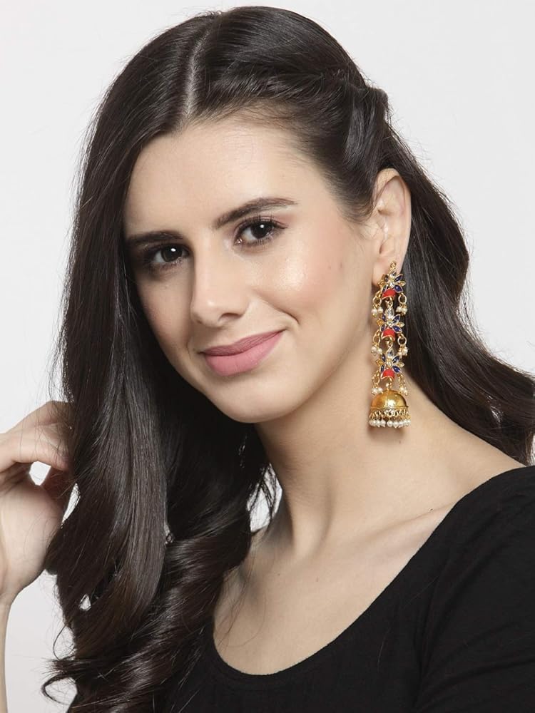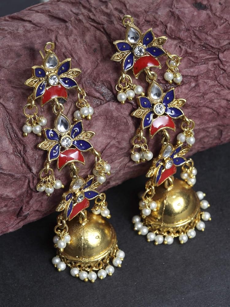 تصميم وأسلوب جذاب: تتميز هذه الأقراط التقليدية للسيدات بتصميم jhumka ذو طبقات من زهرة هلالية جميلة مزين بأحجار بيضاء وخرز وميناكاري كاريجاري. تتميز هذه الأقراط الهندية بنمط معقد مصنوع بشكل رائع على يد حرفيين مهرة. تتميز أقراط jhumka للسيدات هذه بلمسة نهائية وتفاصيل ممتازة لتجعلك تبدين وتشعرين بالجمال.