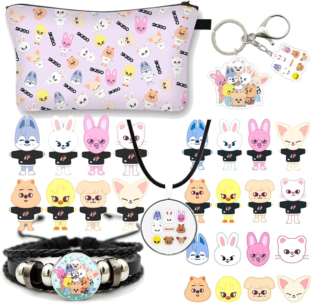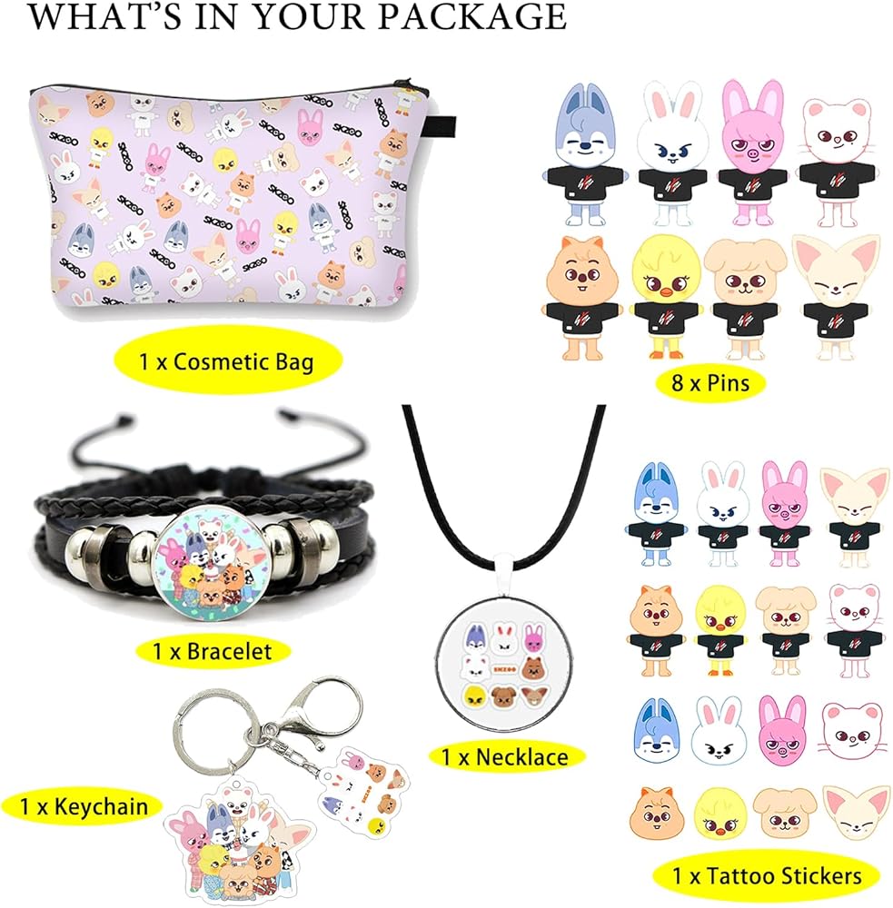 • إكسسوارات هدايا ستراي كيدز ميرش للفتيات: تتضمن حقيبة مكياج سكزو قطعة واحدة، سلسلة مفاتيح سكزو، 8 قطع دبوس زر سكزو، 1 سوار سكزو، 1 قطعة قلادة سكزو، 2 ورقة من ملصقات تاتو سكزو. جميع إكسسوارات سكزو من ايلابوريت ديزاين