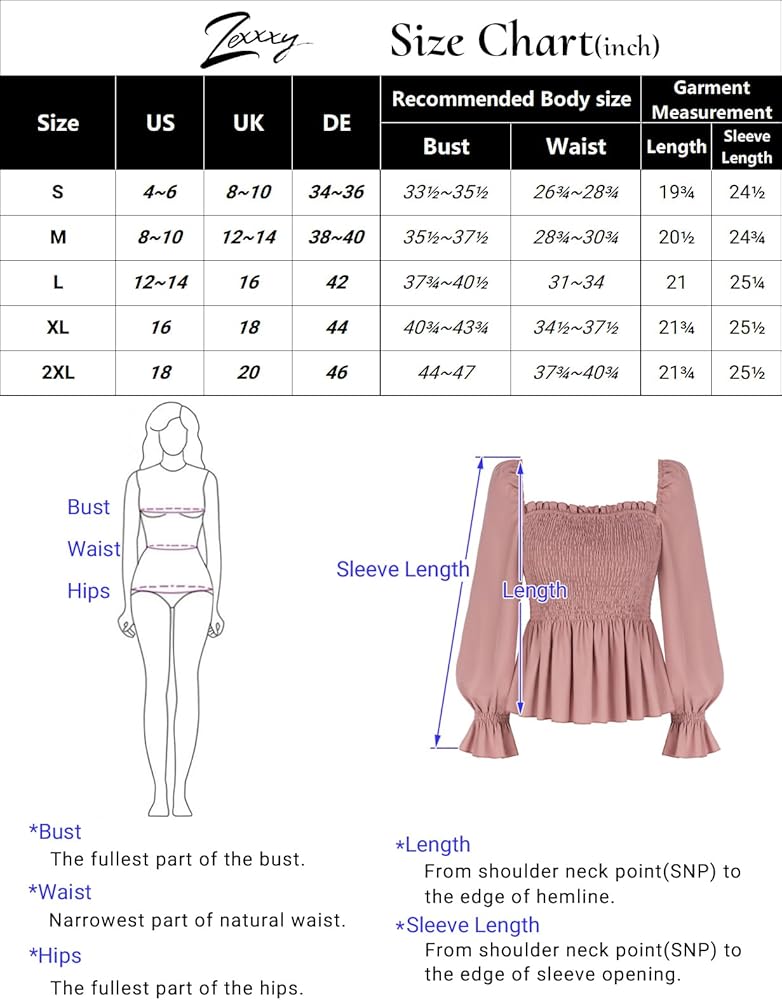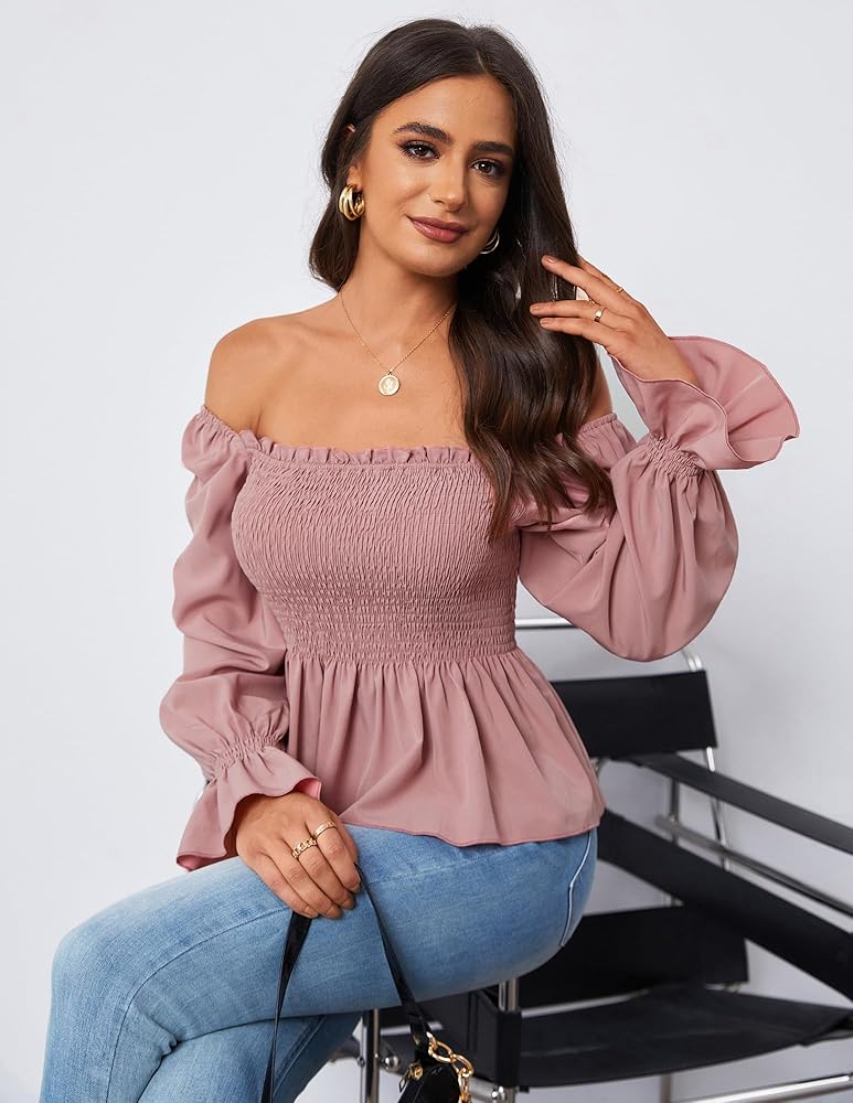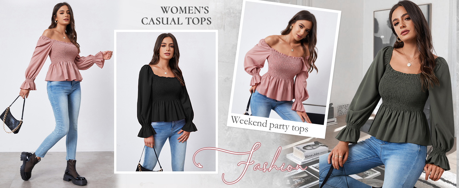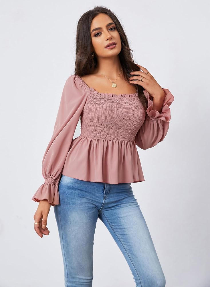 【تصميمات القمصان العلوية】: بلوزة بأكمام طويلة منتفخة مع أساور مدخنة، وصدرية مدخنة، وحاشية مكشكشة، وطول صدرية مدخنة، وطول مكشكش، ونسبة ارتفاع ممدودة.