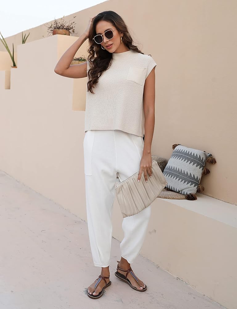 بلوفر علوي: ملابس نسائية كاجوال مكونة من قطعتين، سترة محبوكة، خط عنق على شكل قمع، سترة برقبة وهمية، جيوب أمامية، أكمام قصيرة