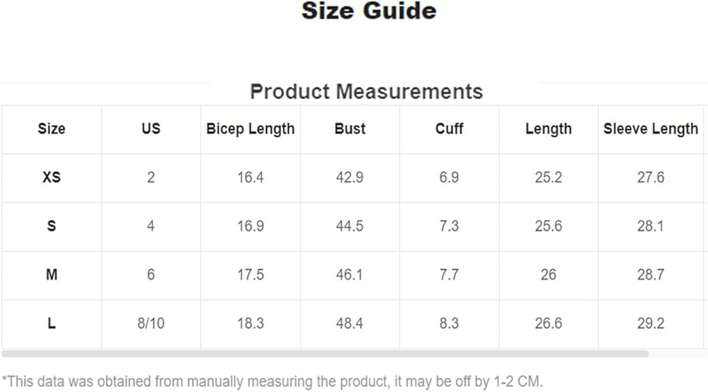قياس المنتج: صغير جدًا: الولايات المتحدة: 2.0 بوصة، طول العضلة ذات الرأسين: 16.4 بوصة، الصدر: 42.9 بوصة، أساور الأكمام: 6.9 بوصة، الطول: 25.2 بوصة، طول الكم: 27.6 بوصة، مقاس الخصر: 43.8 بوصة