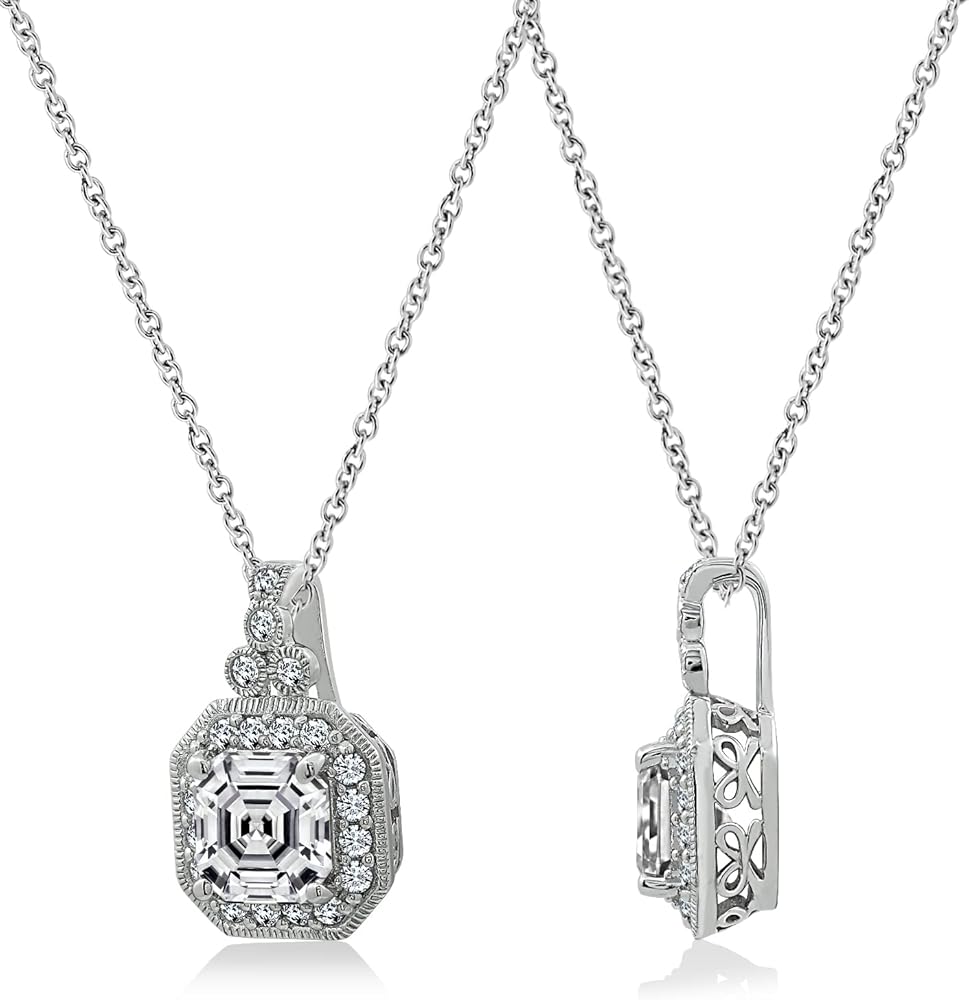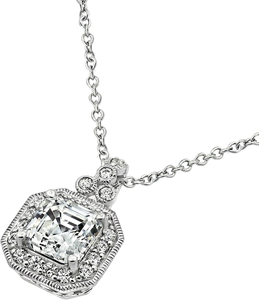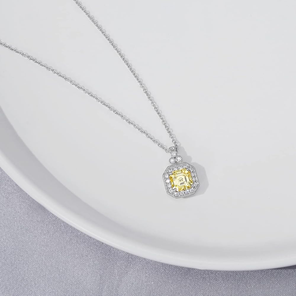 النمط: يبلغ طول قلادة سلسلة الكابل الكلاسيكية هذه 45.72 سم مع قلادة هالة مربعة صفراء رائعة (13 مم طول × 7 مم عرض)؛ قطعة مركزية من الزركونيا المكعبة من قطع asscher مقاس 7 مم محاطة بهالة من أحجار أصغر مقاس 1.5 مم بوزن إجمالي يبلغ 2.3 قيراط.