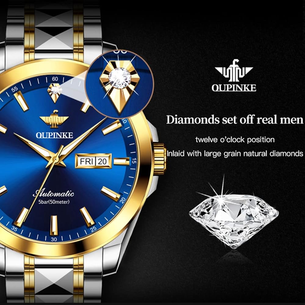 ⌚ ساعة ذهبية ماسية: قرص الوجه الذهبي الكبير مرصع بماسة طبيعية حقيقية عند الساعة 12، مما يظهر الكرامة والسحر. تتيح لك نوافذ التاريخ المزدوجة قراءة الوقت في ثانية واحدة. توفر لك ساعات المعصم التجارية تجربة مريحة وفاخرة.