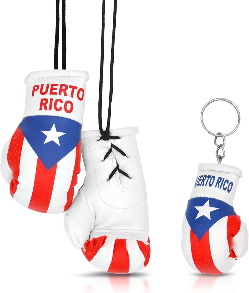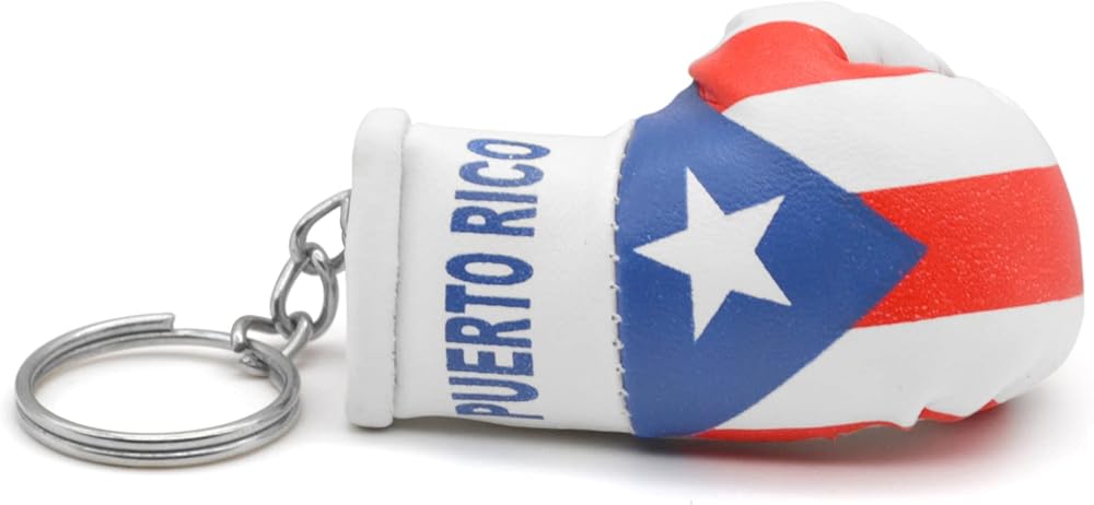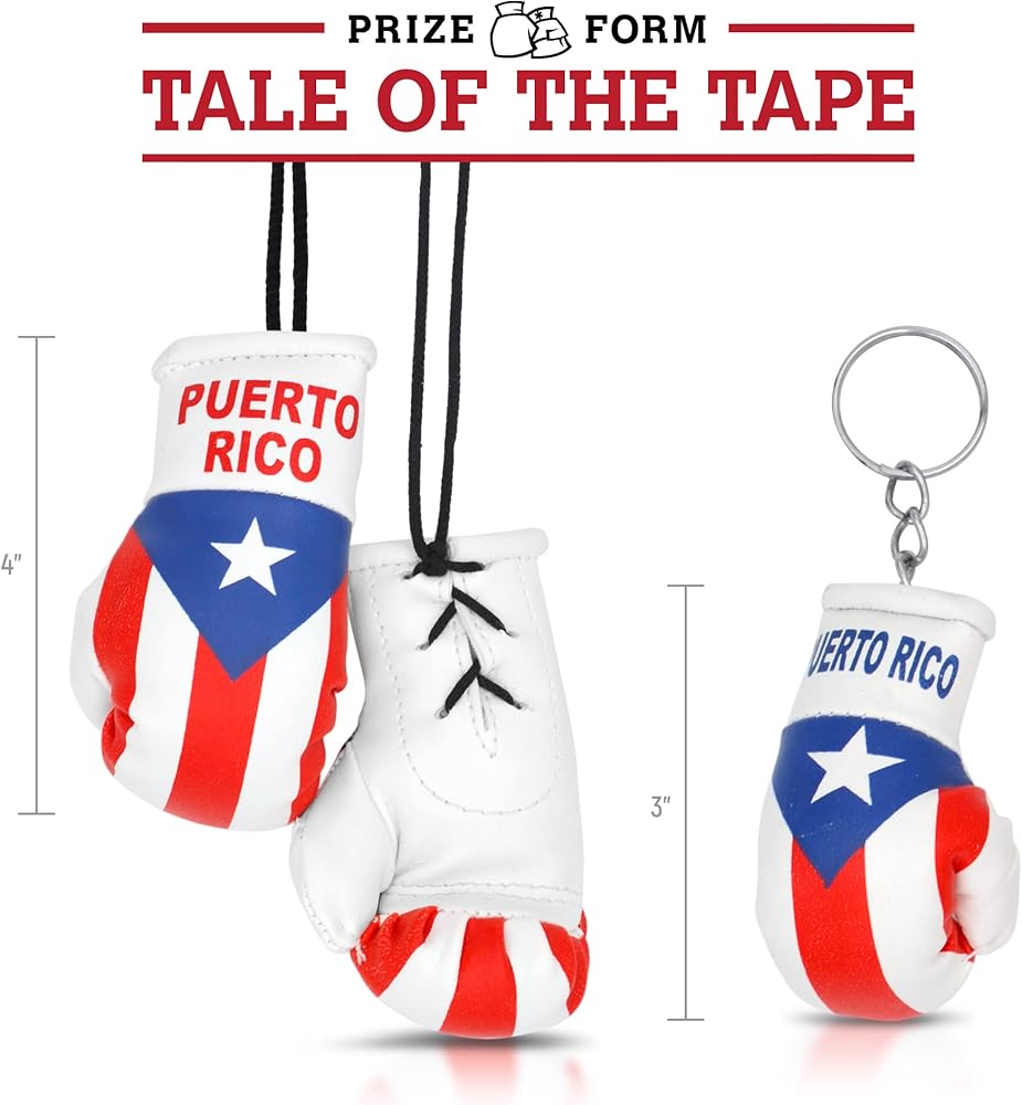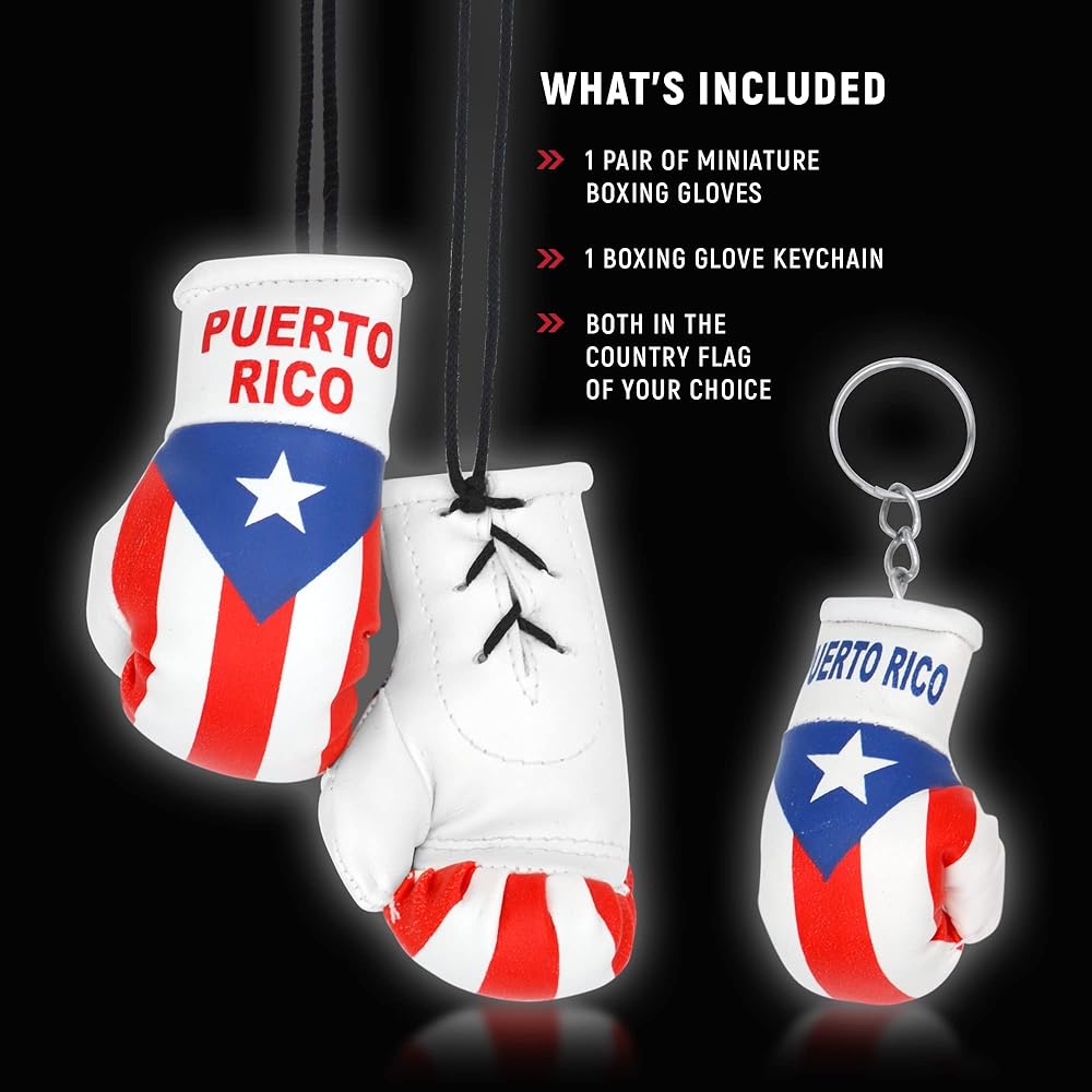 ما يحتويه؟ زوج واحد من قفازات الملاكمة الصغيرة (ارتفاع 8.89 سم ومرفقة بحبل) وقفاز ملاكمة واحد (ارتفاع 5.08 سم) سلسلة مفاتيح في علم الدولة.