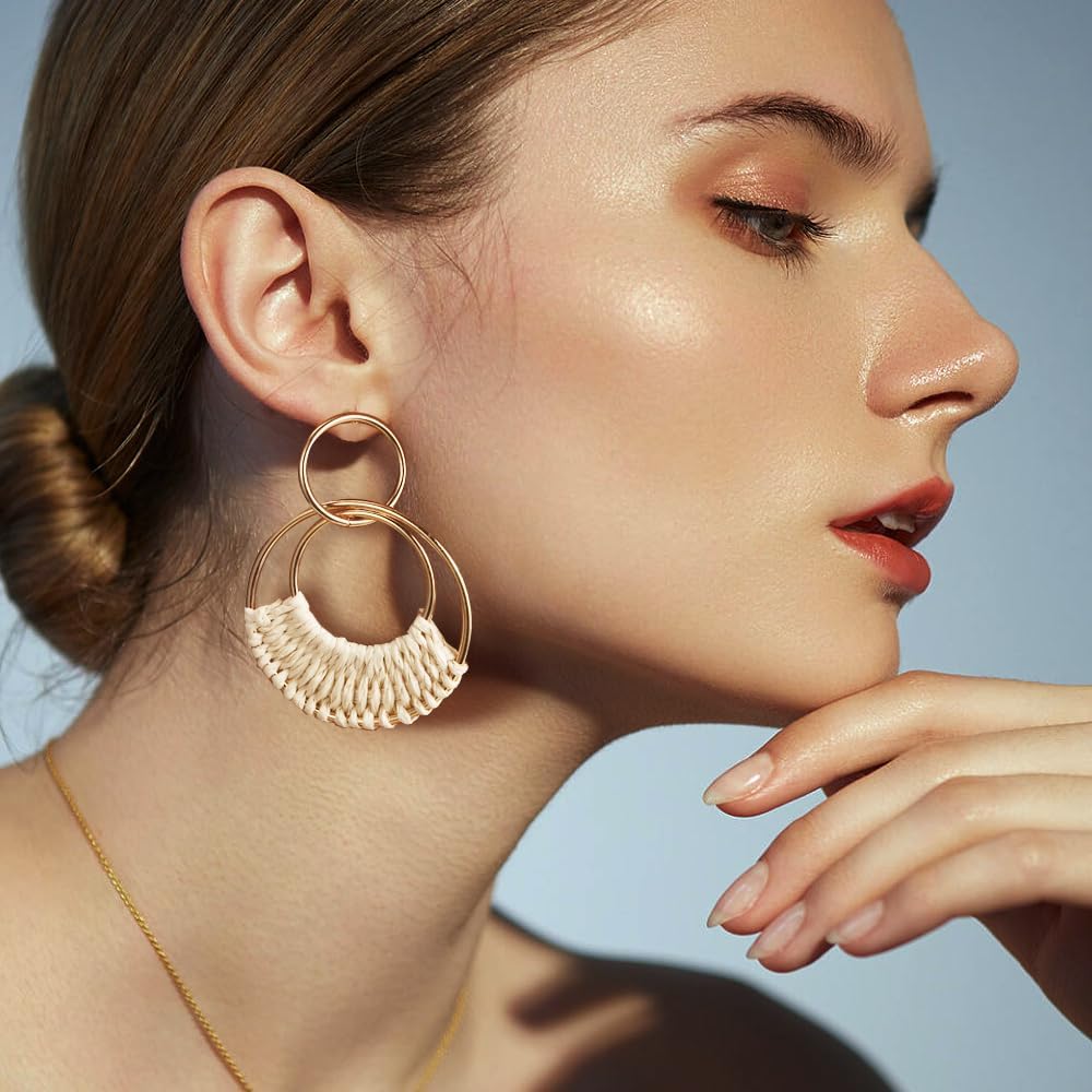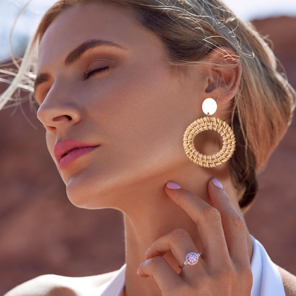 6 أزواج من الأقراط الخشبية الدائرية العتيقة ذات الشكل الهندسي الدائري من بوهو، أقراط دائرية مجوفة من الروطان مصنوعة يدويًا، مجوهرات كبيرة خفيفة الوزن مناسبة للنساء والفتيات